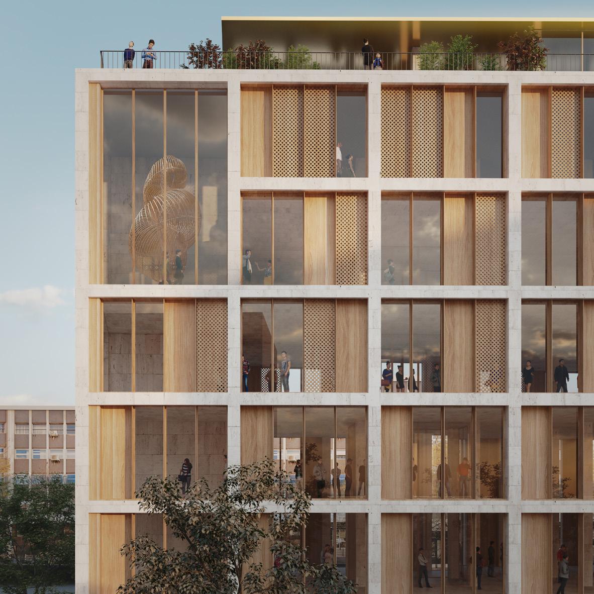building entrance, due to the slope of the site, with a cover park building. The vertical facades are a double skin construction with an exterior screen and ventilated cavity to reduce heat gain. Small openings are adjusted in density to provide the right privacy and light control to the diffrent spaces and uses.The Building is designed to provide optimal environmental conditions for the staff and visitors while minimizing energy demand via a combination of passive and active climate control strategies, thus reducing reliance on fossil fuel energy sources and minimising CO2