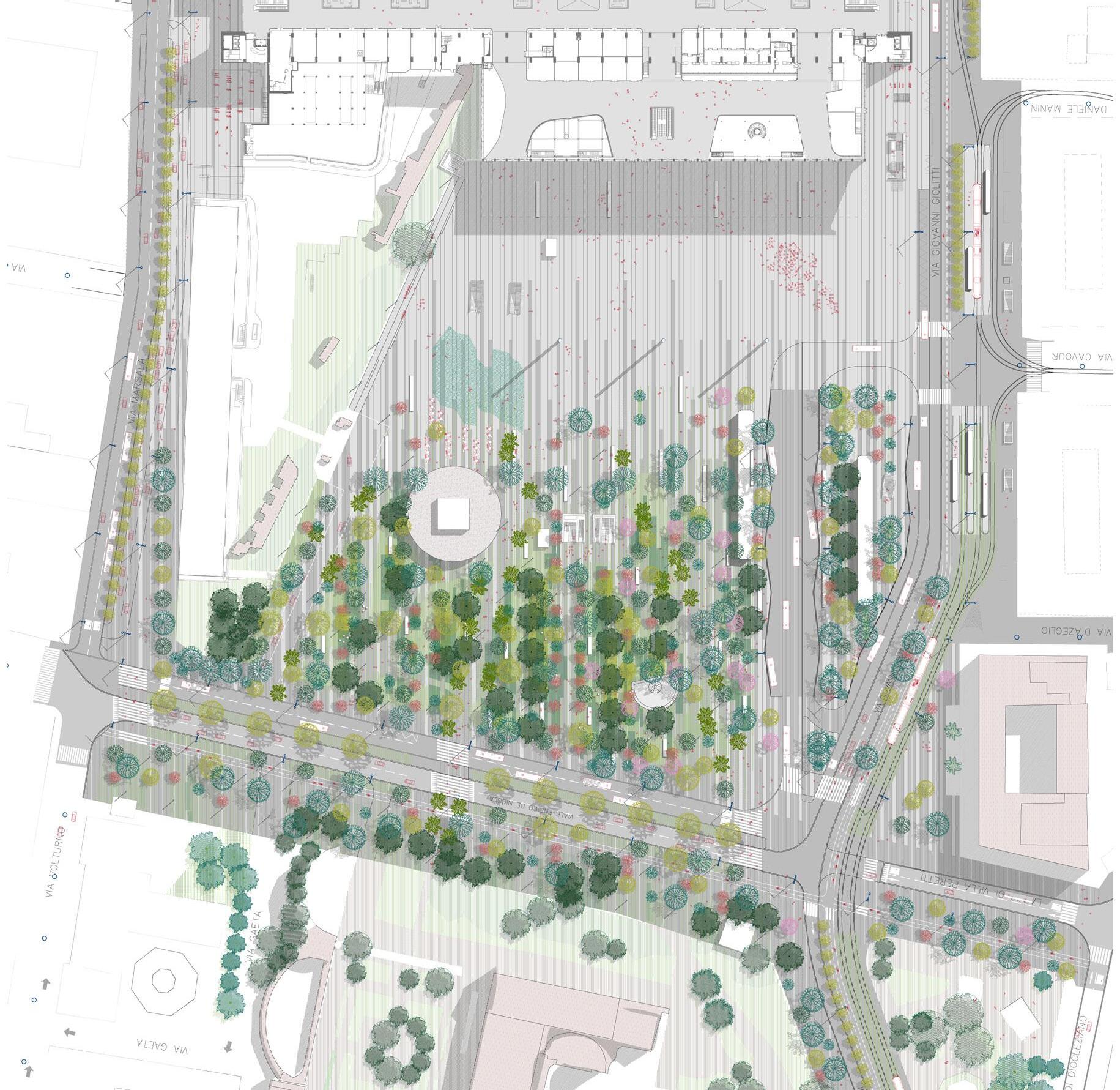 reinterprets the precious fresco depicting the “Giardinio di be combined in alternating bands, composing a pattern of the desire to reconnect the station to the urban fabric,