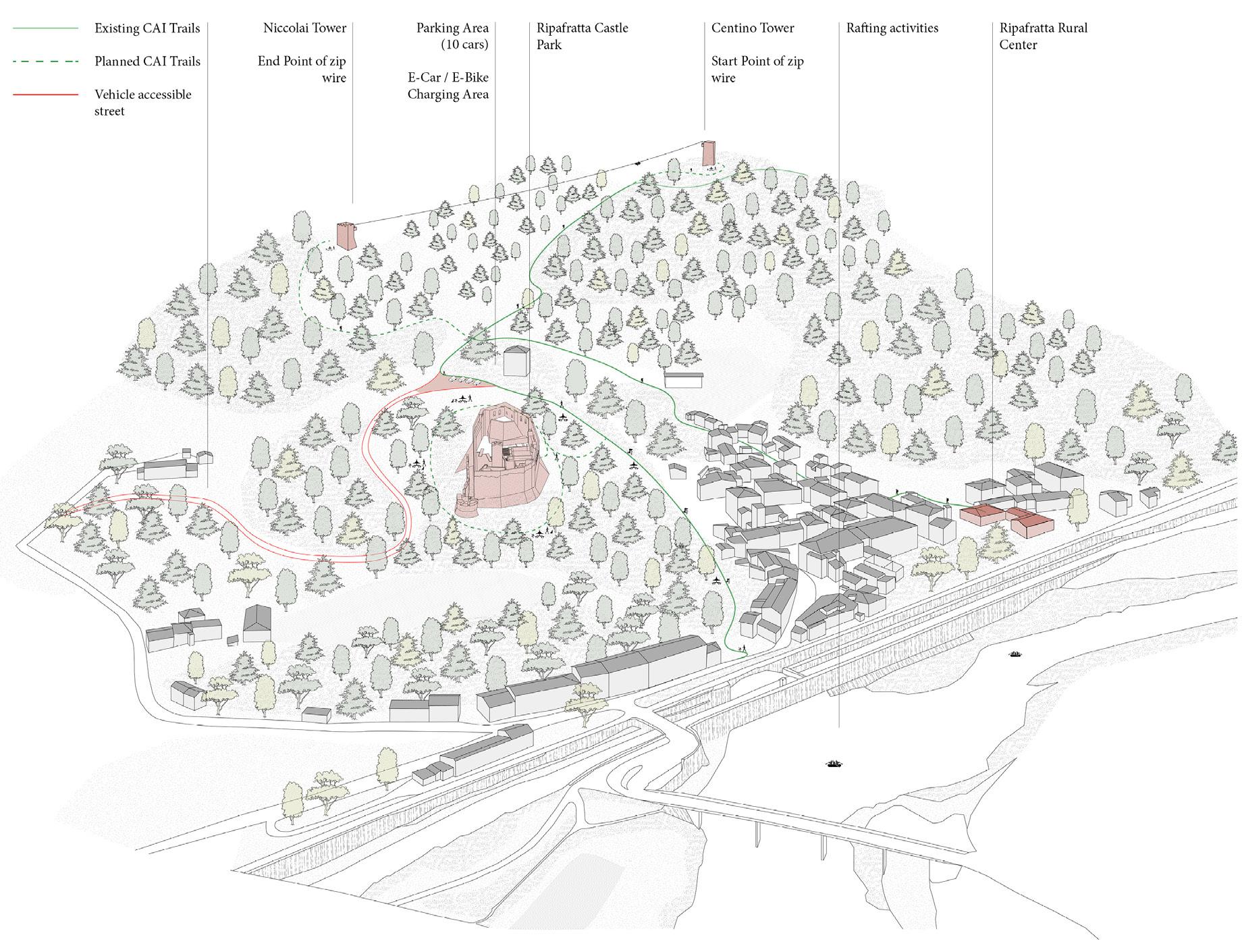 Meriggio in Ripafratta is our proposal for Reuseitaly Competition for Ripafratta Castle designed by Antonio da Sangallo and supported by Leonardo Da Vinci in XVI sig. Thanks to its proximity to the station, to the roads and CAI paths, we thought of recovering the complex of the former salami factory as a new rural centre will welcome visitors and coordinate all the sports activities to create a synergistic system with the castle and the two towers. Inside, the fortress, thanks of this natural slope, a multi-purpose space has been designed, covered by reversible steel and wood pergolas, which extend its use even in winter. A pure volume hosts, on different levels, a bar and a reception for the museum, which is directly connected to the old walkway. The two-tower is thinking as a training space, thanks to a climbing structure inside the towers. The system is complete by a zip wire system connect the two towers offering a different perspective, and