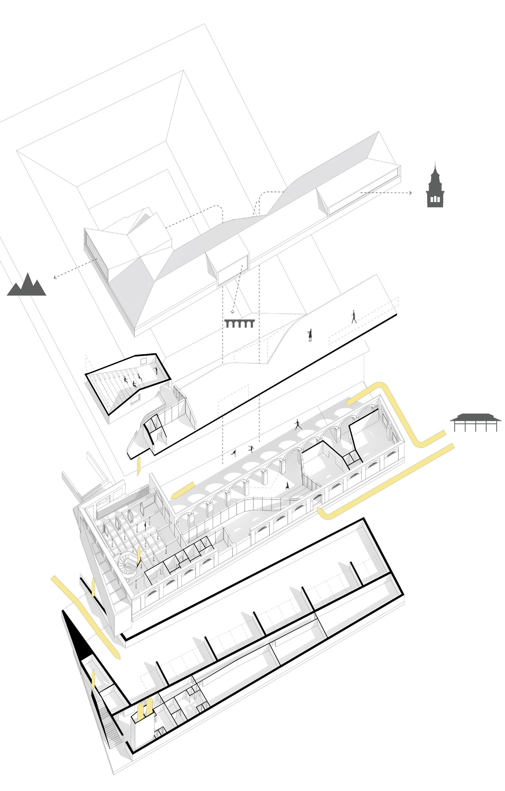 Periscope is our proposal for Ex Frigorifero Militare Competition, is a project that looks at its context and becomes one with it. The building was born from the modeling of the volume of the roof, which is inspired by the typical section of the roofs of Cuneo, whose dormers are extreme to allow the observer to explore the surrounding landscape and emotionally connect with it. The clear volume of the roof, inserted in contrast within the original masonry, is a large panoramic platform whose folds rise and break to frame the Vinay canopy on one side, and