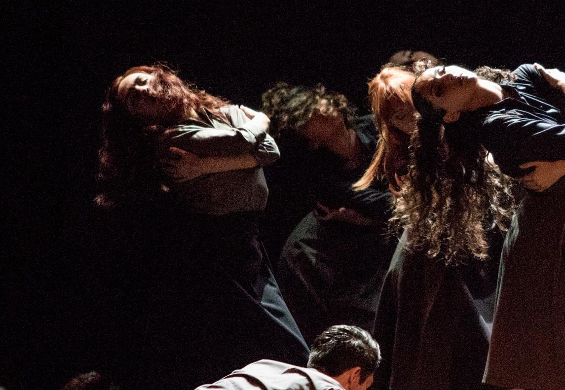 Entre sombras, con una música que va en lento crescendo, se mueven los cuerpos masculinos y femeninos utilizando niveles bajo y medio, con movimientos entrecortados y con una energía cuya intensidad juega con la rebeldía, la desesperación de la vida interior. Y, sin perder la idea de conjunto, acuden signos de cansancio, monotonía e inconformidad. Estas corporalidades se van desplegando de forma individual y colectiva, en un ritmo cada vez más intenso, acorde con la música dolorosa de un violonchelo. Casi de inmediato, las féminas se van retirando, a excepción de una que observa a los masculinos. Estos se contorsionan