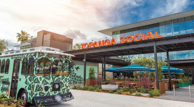 Topanga Social, a 50,000-sq.-ft. dining hall experience, offers 25 food and drink venues and an indoor/outdoor cocktail garden. Tenants include Amboy Quality Burgers, Dumpling Monster, Slab BBQ, and The Pie Room by Curtis Stone