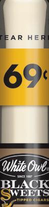 Available in 25ct. FilmFresh™ single stick uprights pre-priced & un-priced. FOR MORE INFORMATION CONTACT YOUR SWEDISH MATCH REPRESENTATIVE. 800-367-3677 • CUSTOMER.SERVICE@SMNA.COM WHITEOWLCIGAR.COM © 2022 SMCI Holding, Inc. PIPE-TOBACCO CIGARS Protected by a first-of-its kind, 100% airtight wrapper, White Owl Black Sweets are always guaranteed fresh, at a price that’s sure to make it your customers’ new favorite.
