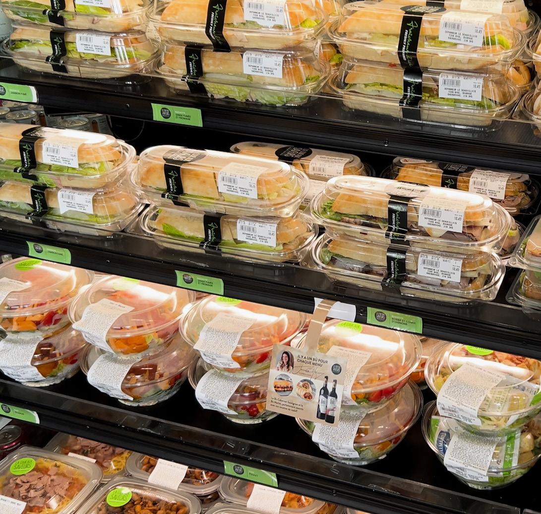 There is an onsite kitchen where cooks create an assortment of readyto-eat meals, including both cold plates (sandwich salad, pita, snacks, prepared meals) and hot meals (pizza, fries, breakfast offers, soups and rotisserie chicken), and a range of baked-in-store and pre-packaged bakery products available in single or bulk options. The frozen food selection again matches what one can find in a grocery store, with meats sourced from local butchers, which can be paired with fresh fruits and vegetables, cheese and fine cheese, charcuterie, fresh pasta, sauces and salads.
