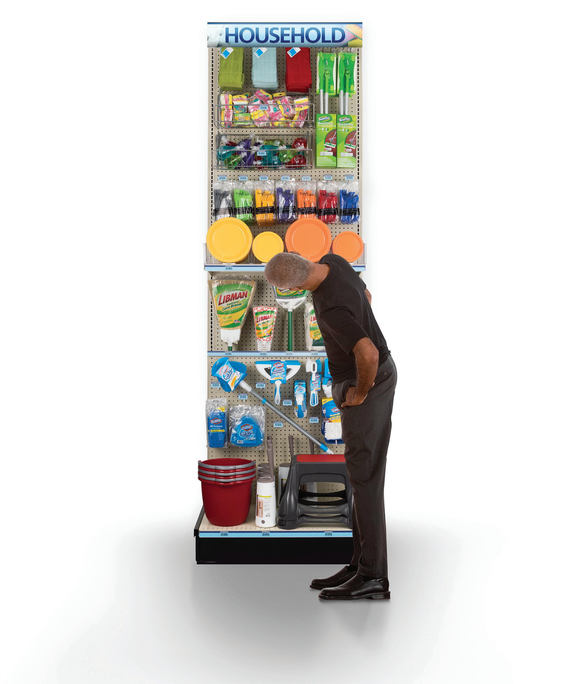 layer display surfaces so you can simultaneously show tall and short items. Commonly used to merchandise mops, brooms, long handled tools and more, with cross sells and accessories directly in front. Pegboard extenders extend your merchandising reach.