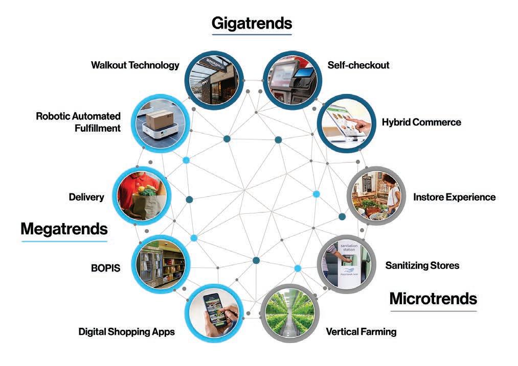 These trends have been underway in food and grocery for at least a decade, and the most significant one is the “phygitalization” of retailing, reshaping society, grocery and how we experience commerce. The term “phygital” has begun to be more widely accepted as the accelerated merging of the physical and digital commerce realms — a seamless integration of virtual shopping that’s surpassing the in-store ex perience. Phygital transformation includes the wholesale adoption of technology by shoppers, merchants and vendors. It truly leverages technology for the full spectrum.