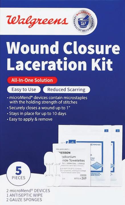 Unlike other first aid kits or wound care kits that have been common in the First Aid department for years, the Walgreens Wound Closure Laceration Kit is for more severe cuts and lacerations. This product is very easy to use and is proven to reduce scarring as well. The microMend® devices in the kit contain microstaples with the holding power of stitches. This is truly a new, innovative, advanced wound care solution for Walgreens customers.