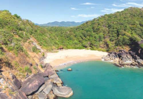 potężna twierdza zbudowana z cegły błotnej, wpisana na listę UNESCO. Obok: Wadi Shab – wąwóz, łączący wielkie skały, masę zieleni oraz krystaliczną wodę. Na dole: plaża w pobliżu miasta Salalah.