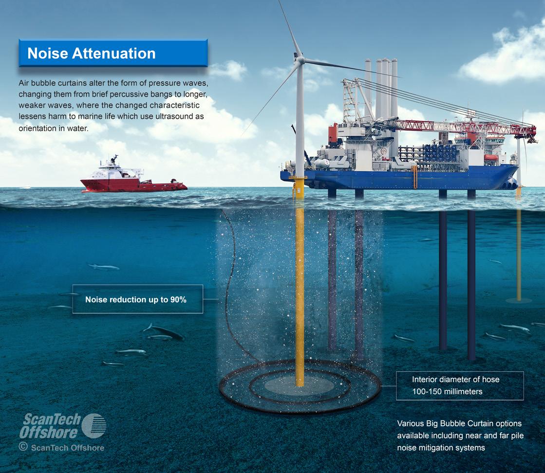A high flow of compressed air is required to create a well-formed and effective bubble curtain. Not as simple as pumping gas down a tube, the air that goes into the water must be Class Zero ‘clean air’ and must be moved in huge volumes at pressure. To create the force, ScanTech Offshore stacks up multiple compressor units alongside its SeaSentry system, which ensures air is contaminantfree and leaves no negative environmental impact in the water.