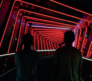 Daarnaast ziet hij dat hun creatieve aanpak ook steeds vaker wordt gevraagd in de zakelijke markt. “We passen onze kennis van beleving en storytelling graag toe in corporate omgevingen,” zegt Adema. “Voor het NBC Congrescentrum in Nieuwegein hebben we bijvoorbeeld een 30 meter breed projectiedecor ontworpen dat volledig aan te passen is per klant, met optische illusies en 3D-vormen. Dat maakt een enorm verschil met de traditionele setting van een podium met een LED-scherm.”