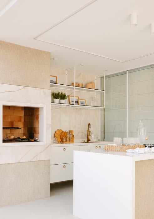 na iluminação e ventilação ao longo do dia. A área gourmet tem bifeteira, churrasqueira e parrilla. Sobre a bancada de mármore, a torre de chopp reforça a vocação festiva do lugar. As portas do armário são em compensado naval pintado e a mesa tem tampo de madeira maciça.