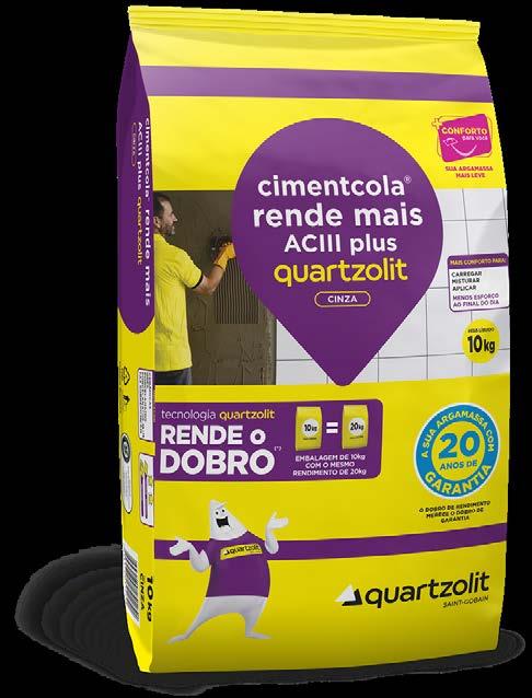 A QUARTZOLIT apresenta a versão de alto rendimento da famosa Cimentcola, produto exclusivo da marca. A nova Cimentcola Rende Mais ACIII Plus chega com tecnologia que promove rendimento em dobro. O produto oferece ainda um maior conforto para o aplicador, por ser mais fácil de transportar, misturar e aplicar, aumentando a produtividade do profissional. Além disso, a argamassa possui 20 anos de garantia e é mais sustentável, utilizando menos embalagem e materiais, o que resulta em menor desperdício. BRISES