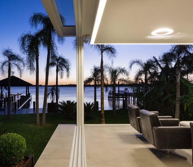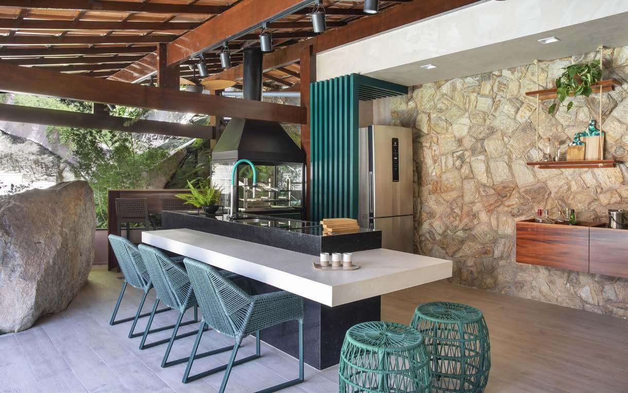 evido à vida agitada dos moradores, a ideia era que a casa passasse a ser um refúgio de descanso e lazer, para que a família e também os amigos pudessem usufruir do bem-estar propiciado por um espaço acolhedor. Para isso, os clientes solicitaram a integração entre o espaço gourmet e a área de lazer externa.
