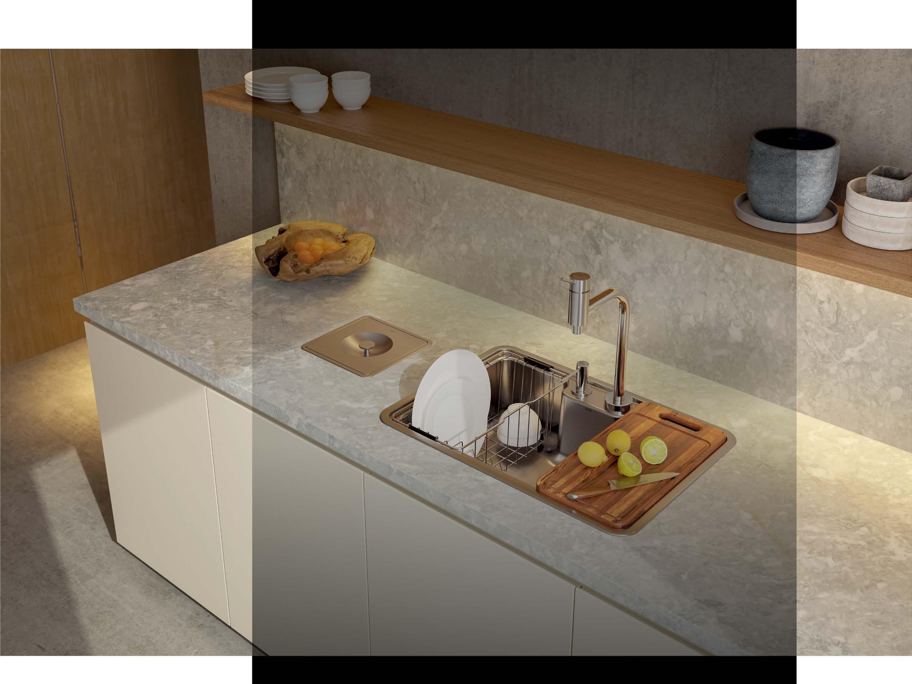 veirão receberam a pedra Colosseo acetinada, criando um ambiente fresco e contemporâneo.