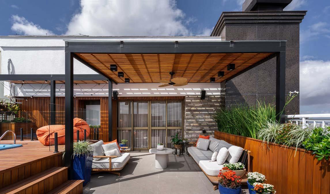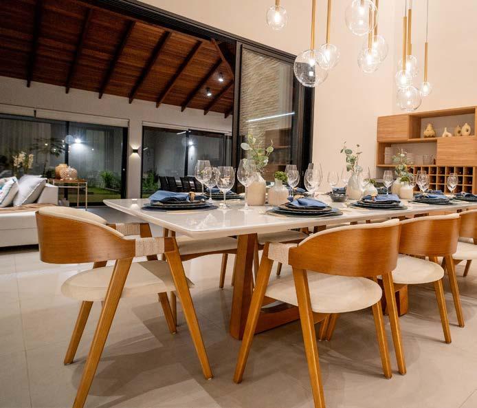 na, com seu acabamento Fiji em tons de verde, 20x20 cm, harmoniza com o paisagismo, sendo que o seu entorno recebeu a pedra atérmica cimentícia, 50x50 cm. A ala gourmet se destaca pelos tons neutros, especialmente com o piso York SGR 87x87 cm, tornando-se o coração da casa, o lugar ideal para receber amigos e familiares. O paisagismo emoldura a edificação com plantas que trazem vida e frescor. Por sua vez, a pérgola converte-se no centro das atenções dos convidados, atraindo olhares e proporcionando um agradável espaço para relaxar e socializar.