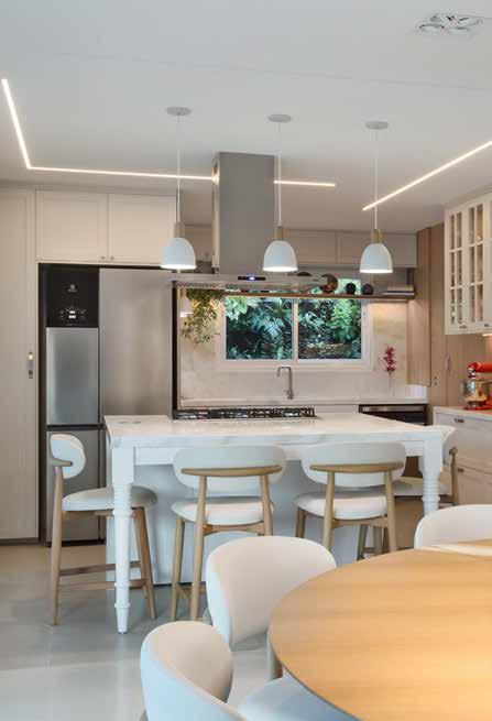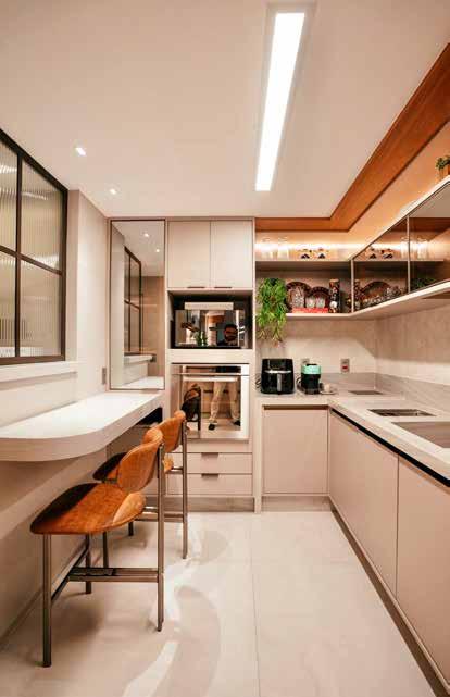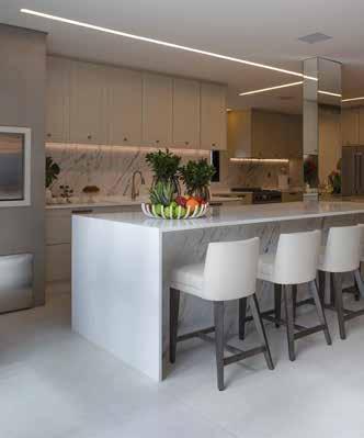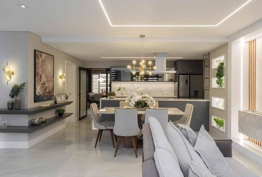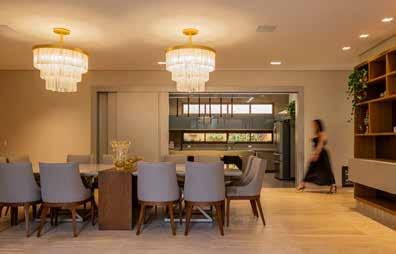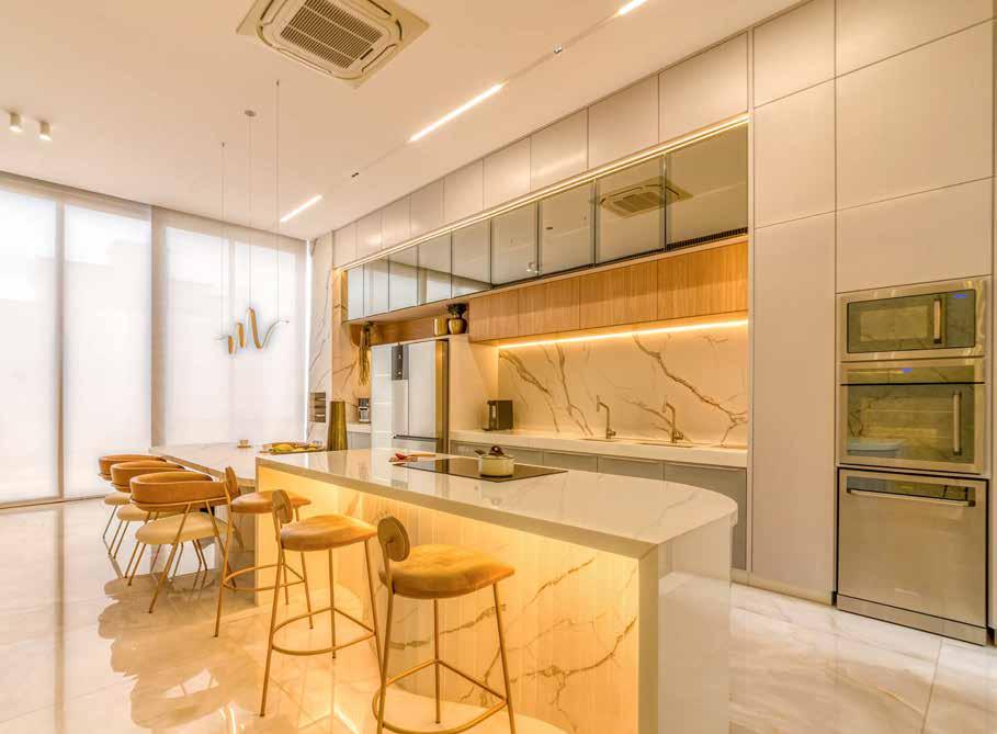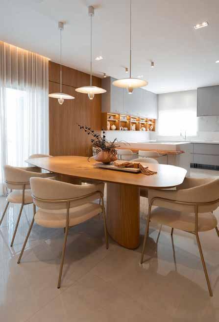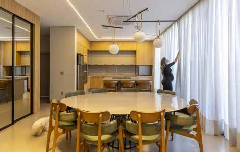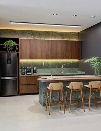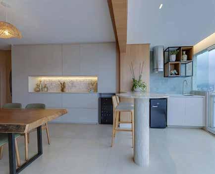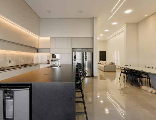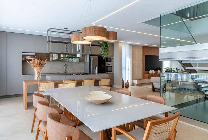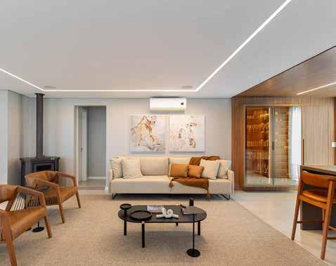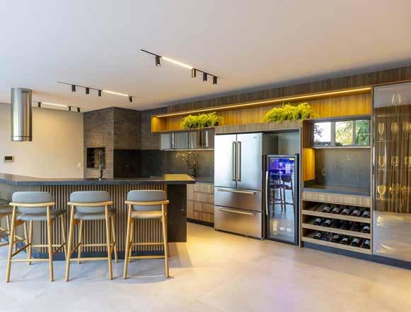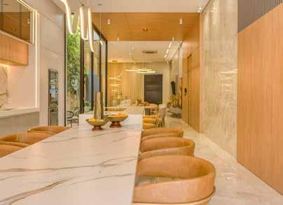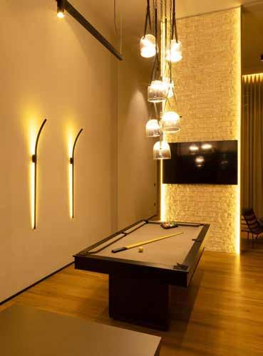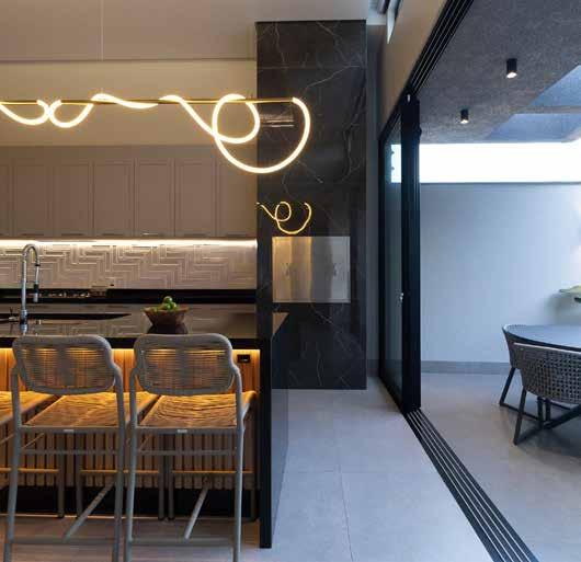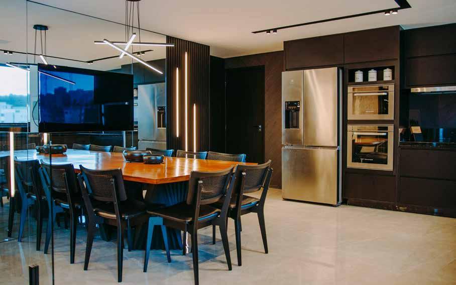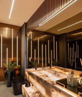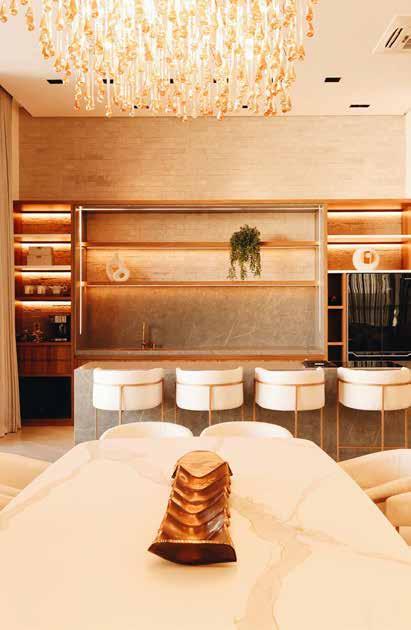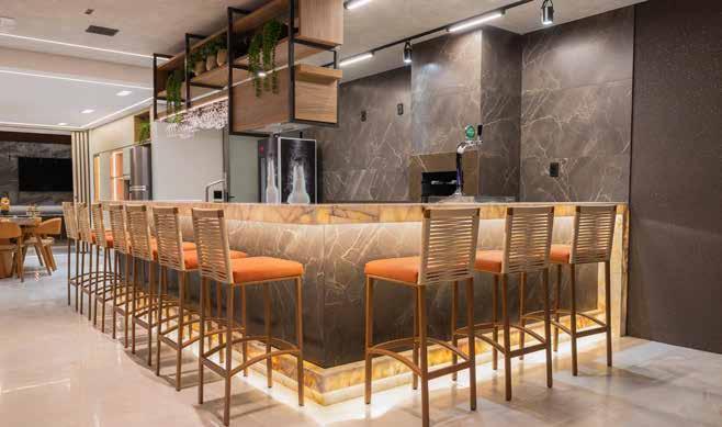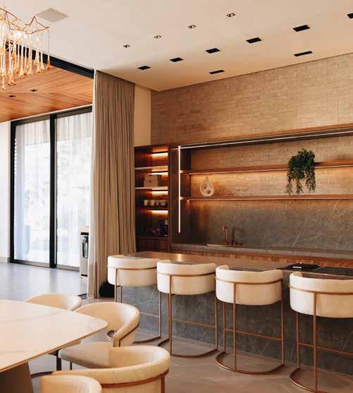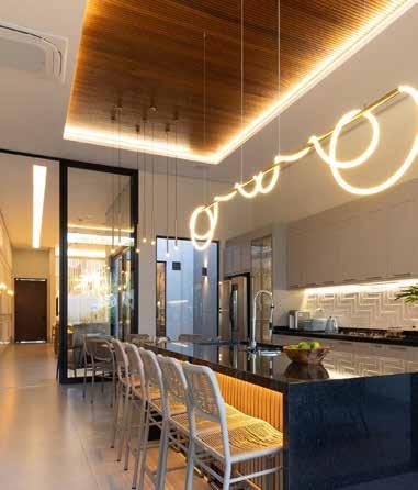 tar e o bar iluminado compõem um espaço versátil, que combina elegância e funcionalidade. Pendentes, spots direcionáveis e fitas de LED pontuam volumes e texturas.