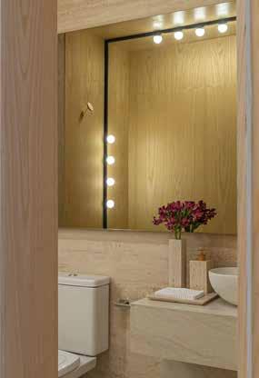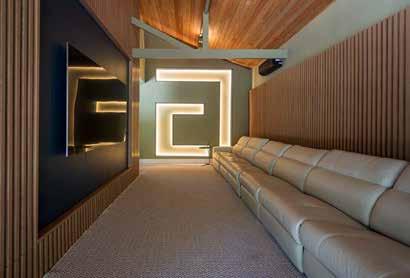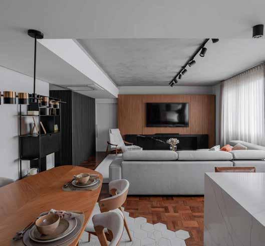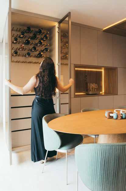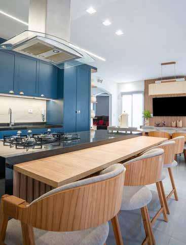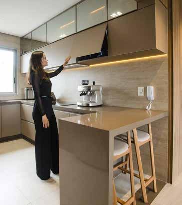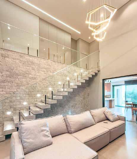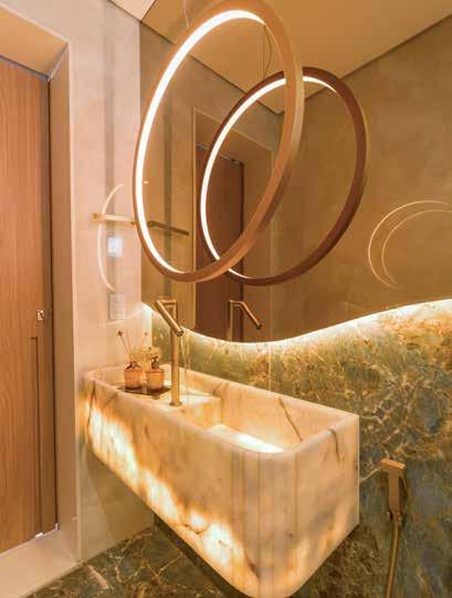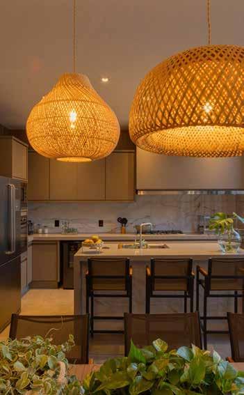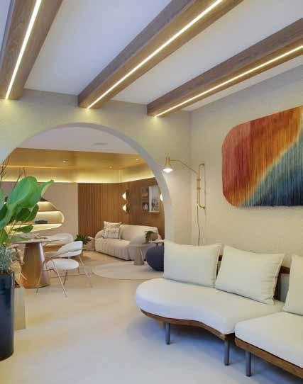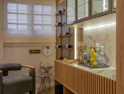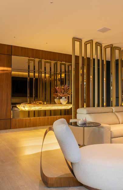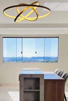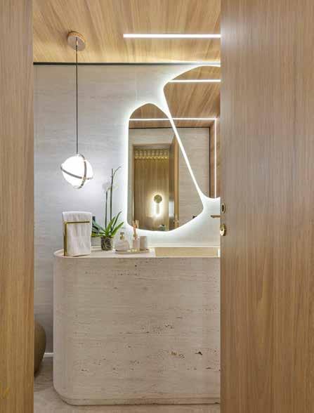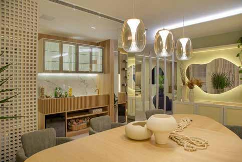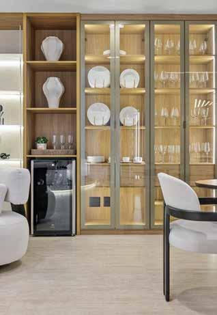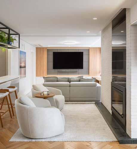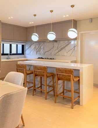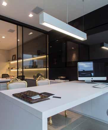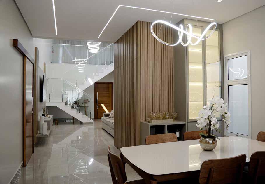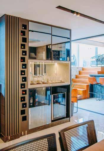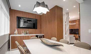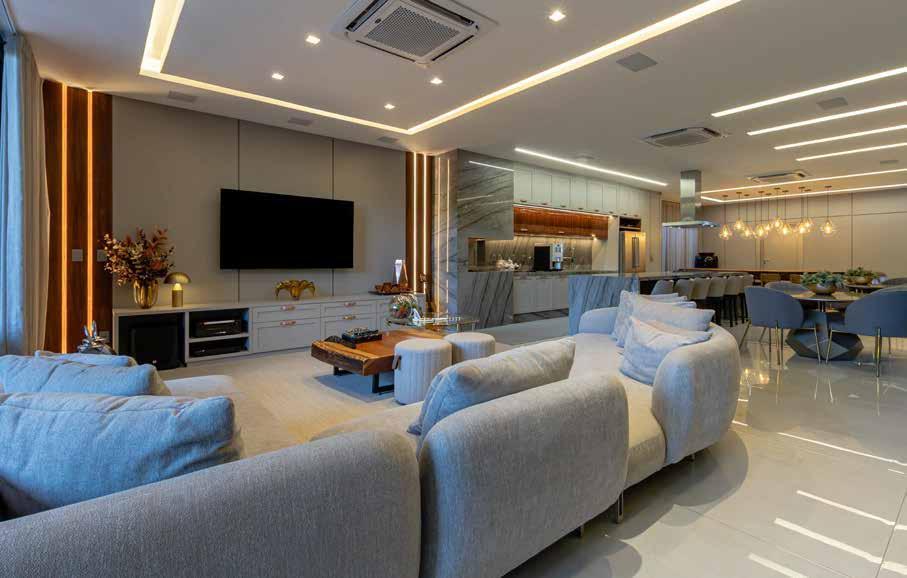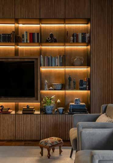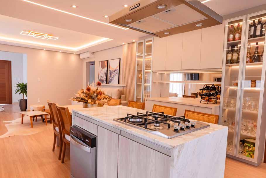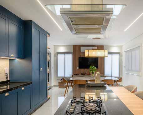 tar e o bar iluminado compõem um espaço versátil, que combina elegância e funcionalidade. Pendentes, spots direcionáveis e fitas de LED pontuam volumes e texturas.