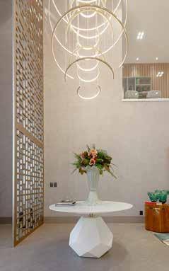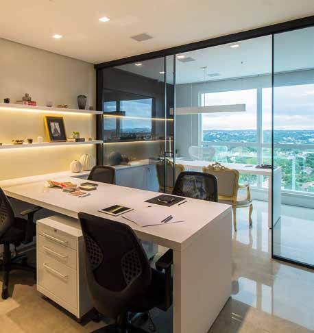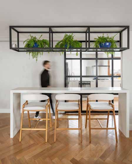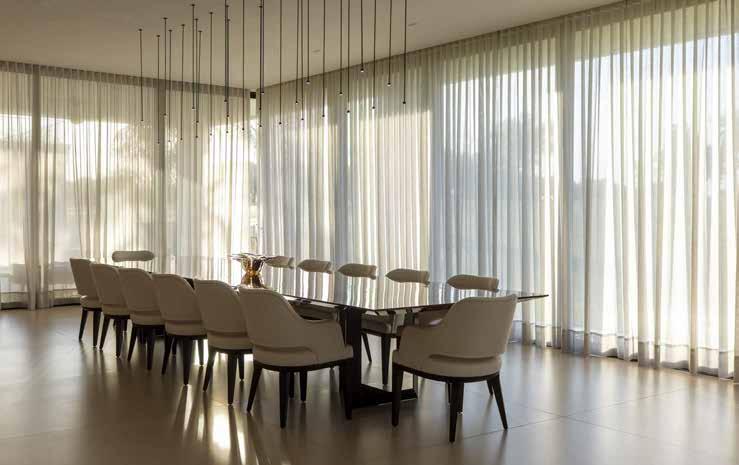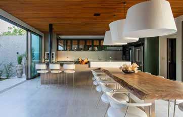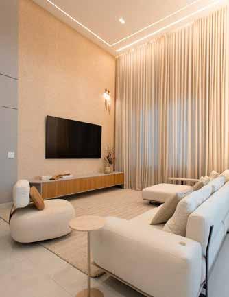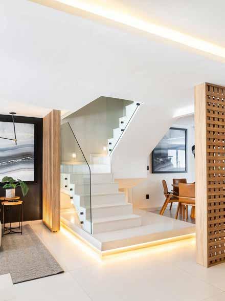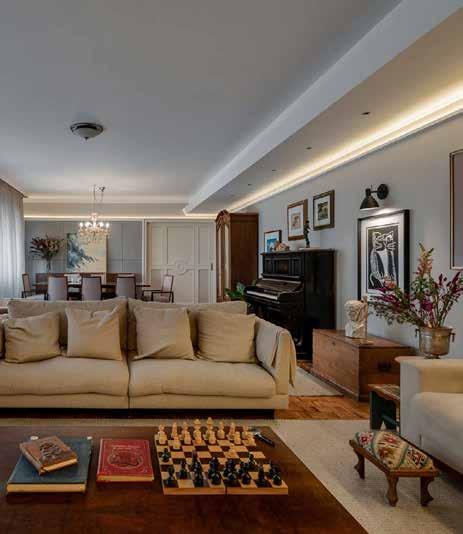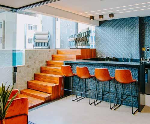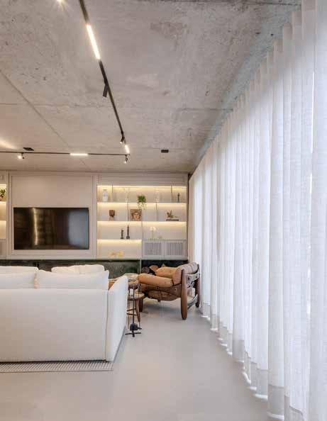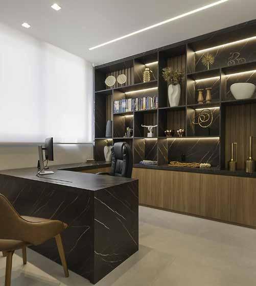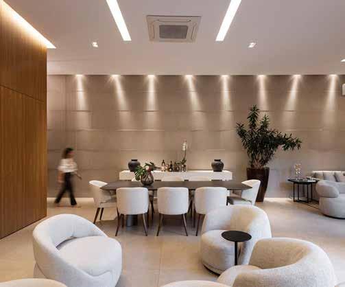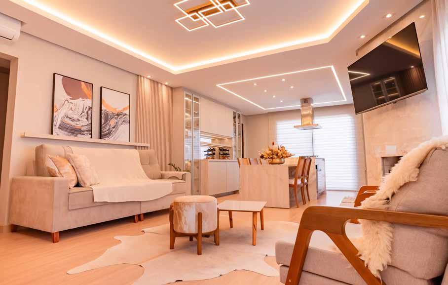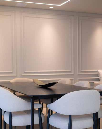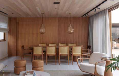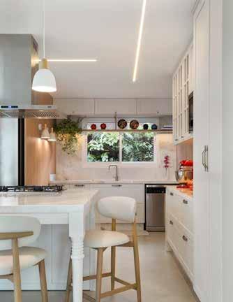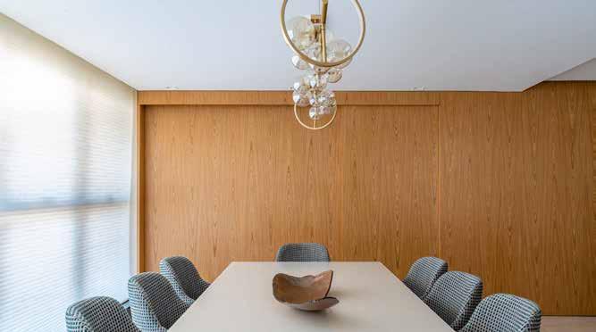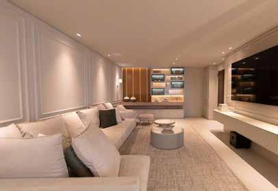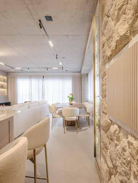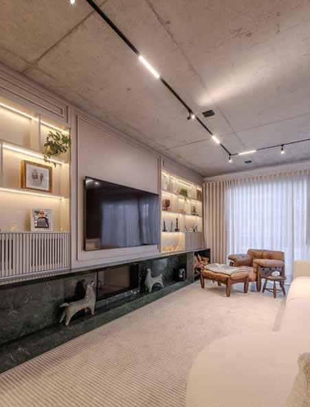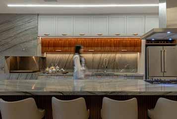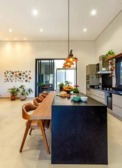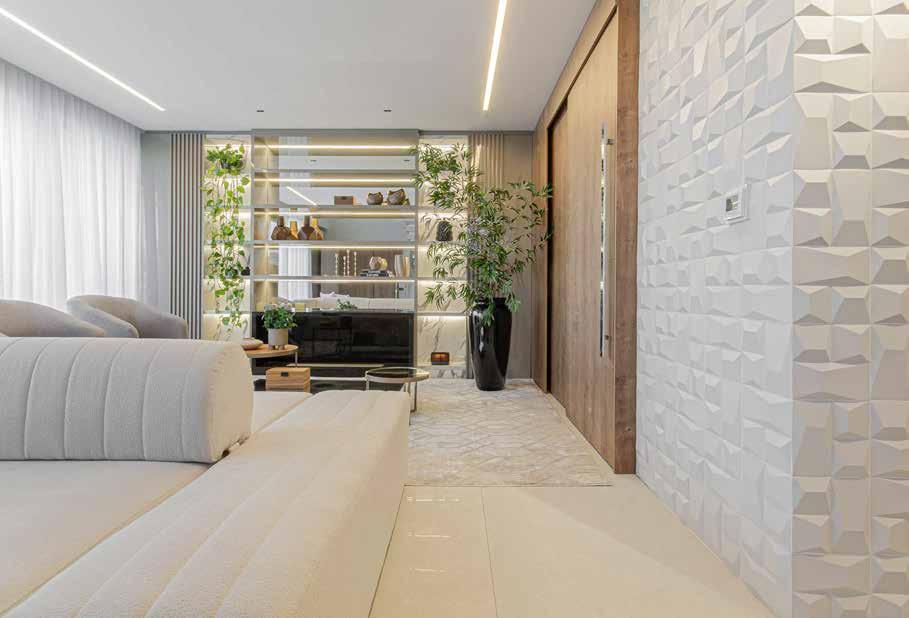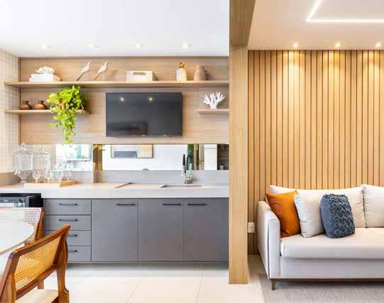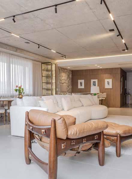 tar e o bar iluminado compõem um espaço versátil, que combina elegância e funcionalidade. Pendentes, spots direcionáveis e fitas de LED pontuam volumes e texturas.
