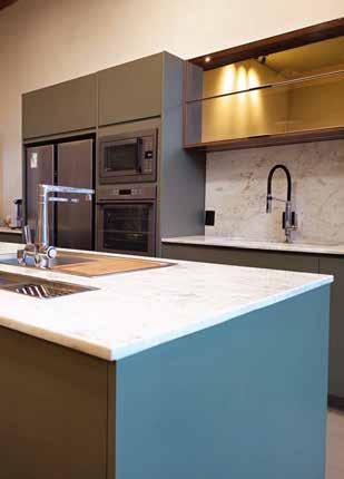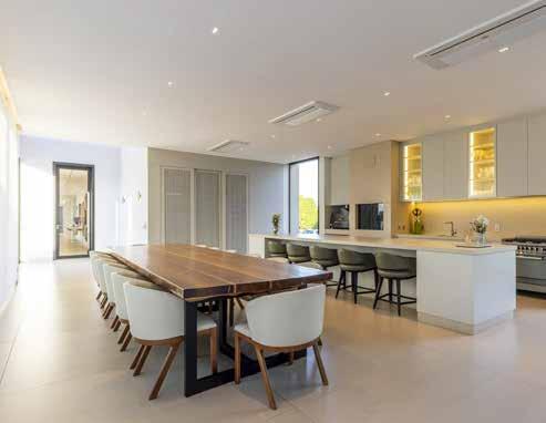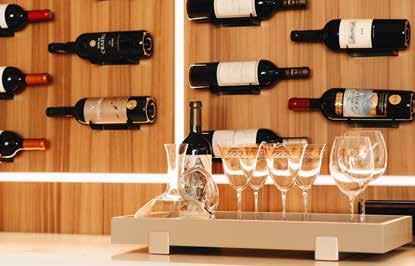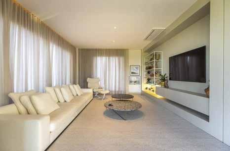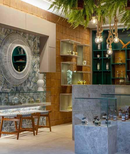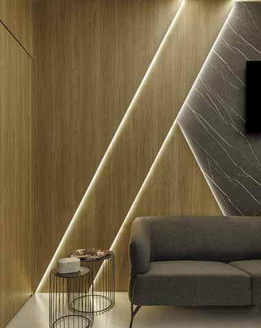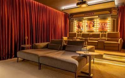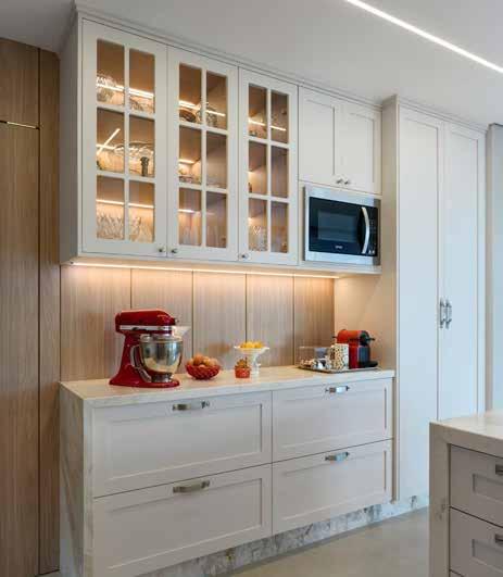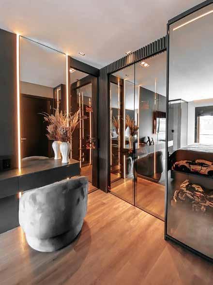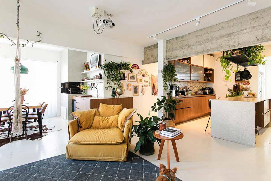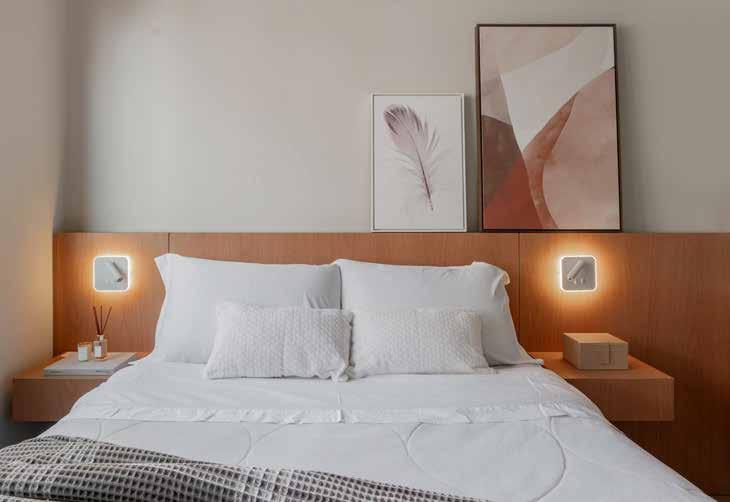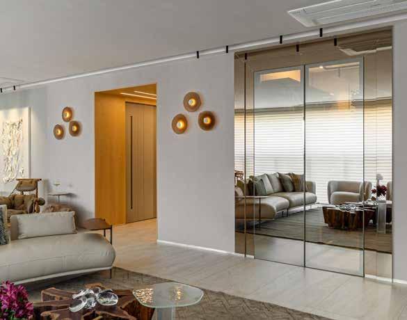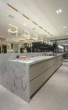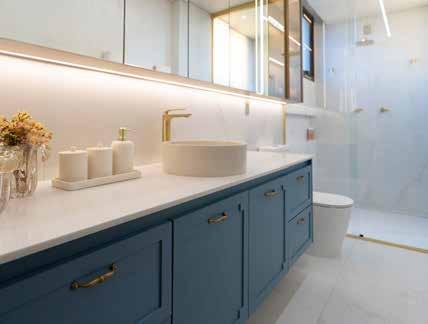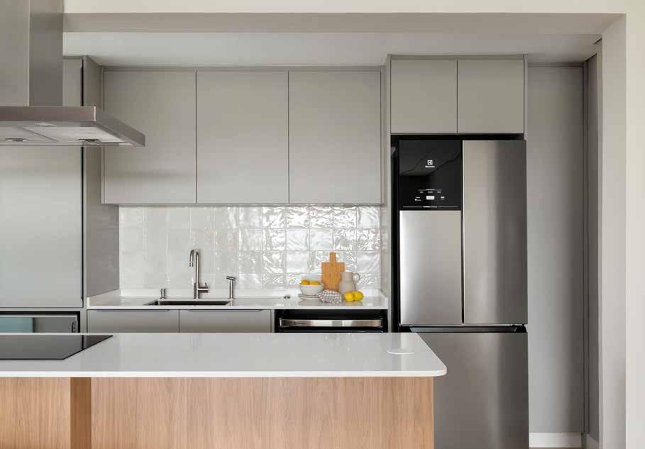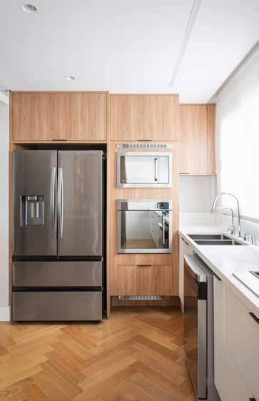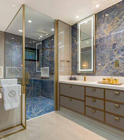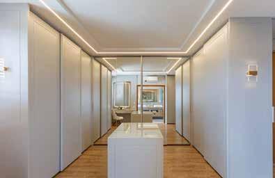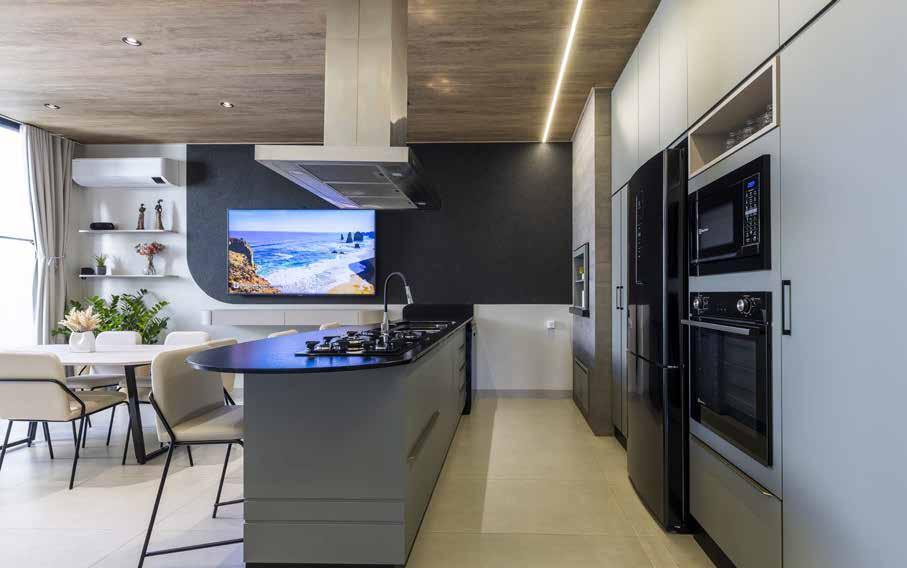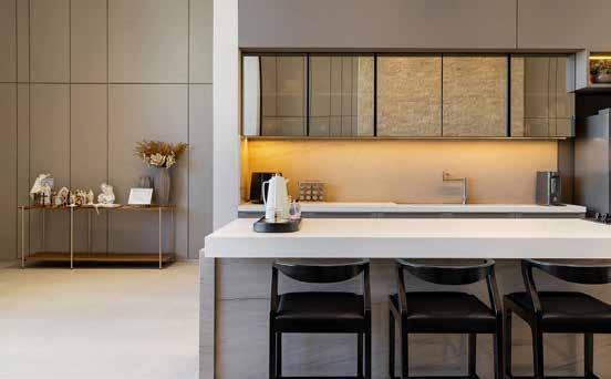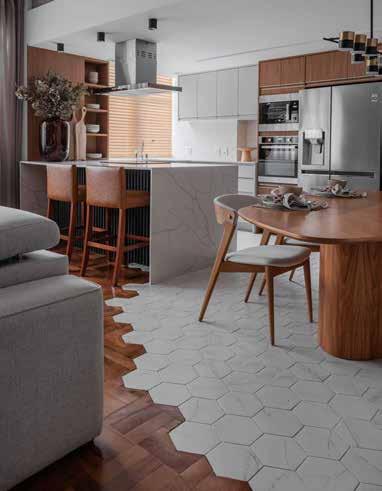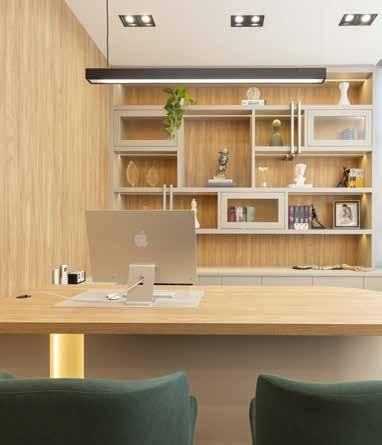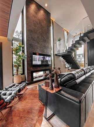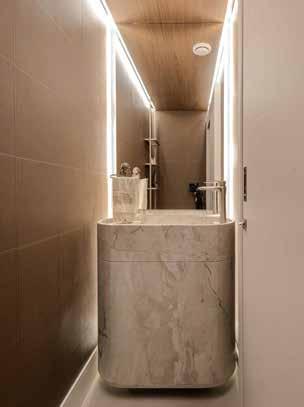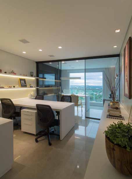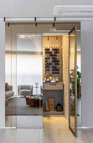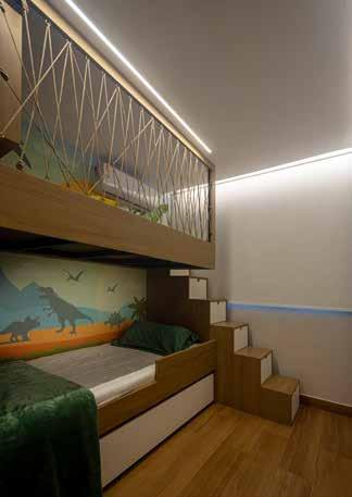 tar e o bar iluminado compõem um espaço versátil, que combina elegância e funcionalidade. Pendentes, spots direcionáveis e fitas de LED pontuam volumes e texturas.