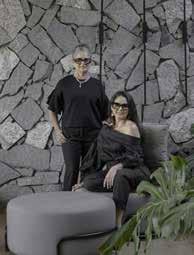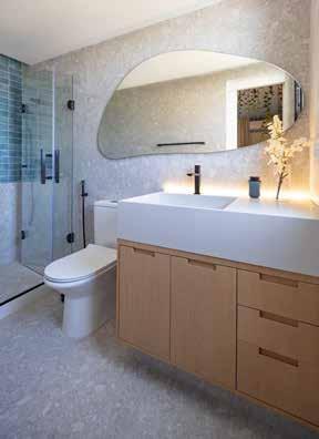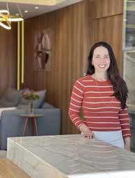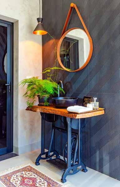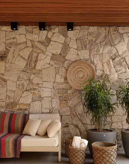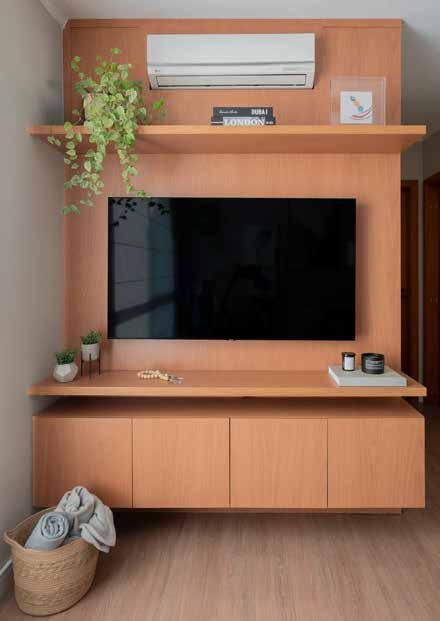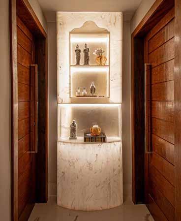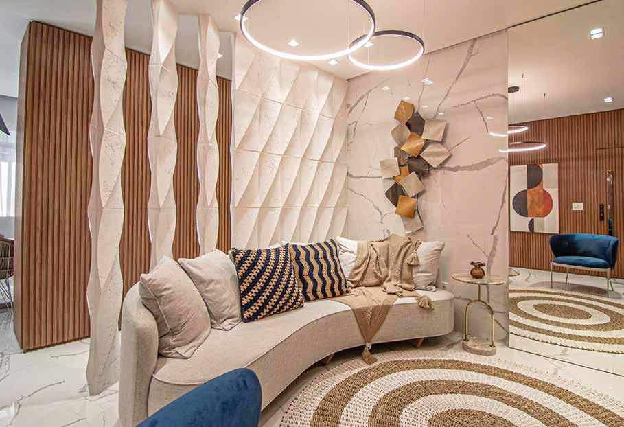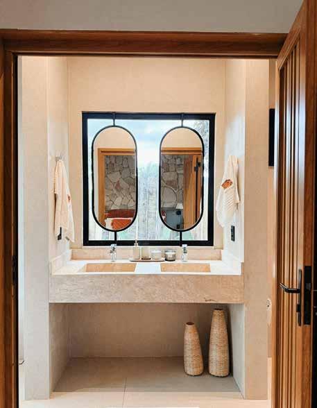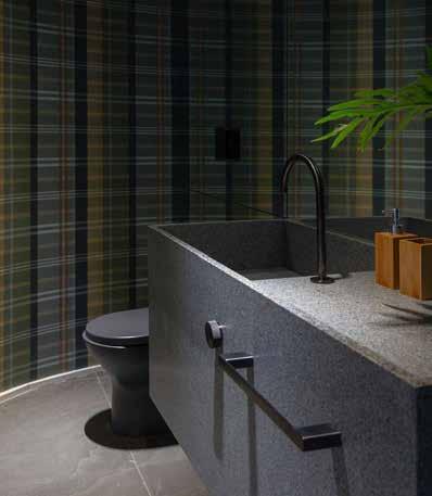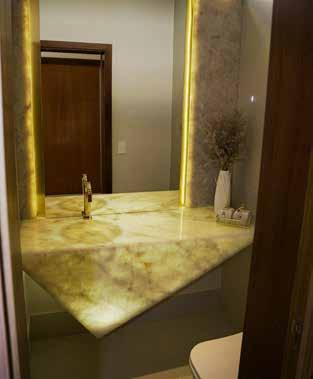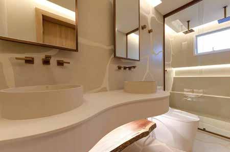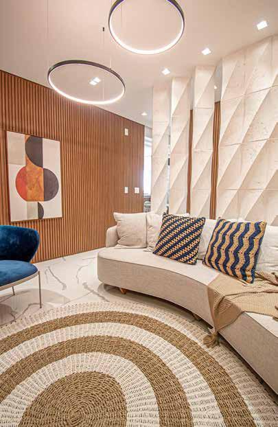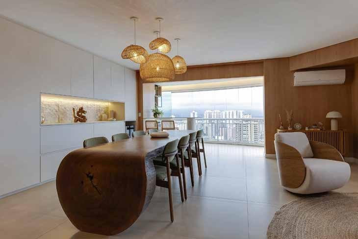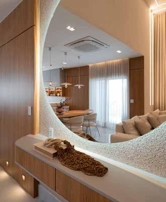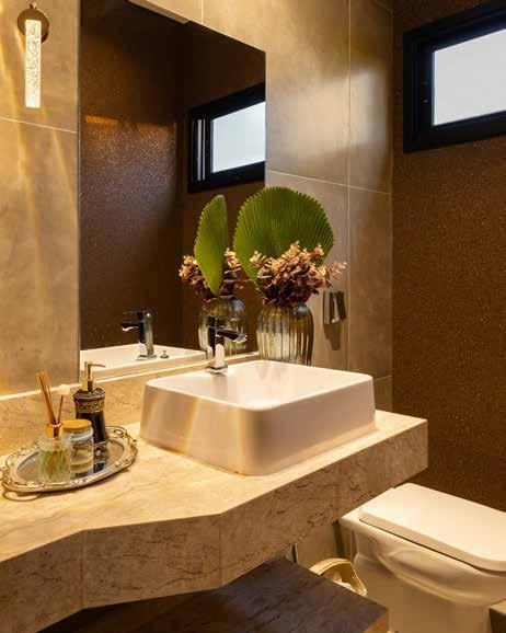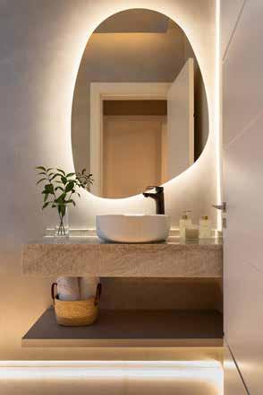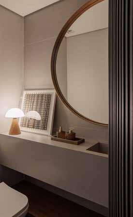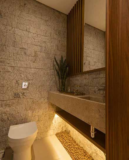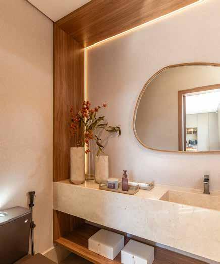 Na varanda gourmet, foi utilizada a pedra Hijau; no nicho da sala, pedra bruta, trazendo textura e autenticidade. A área social recebeu tons terrosos e amadeirados, criando um ambiente sensorial e acolhedor. O banheiro segue a linguagem orgânica, com revestimentos e bancada curva, promovendo leveza e relaxamento.
