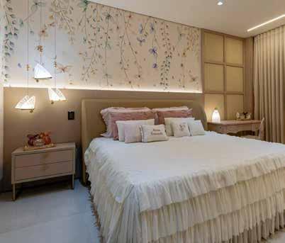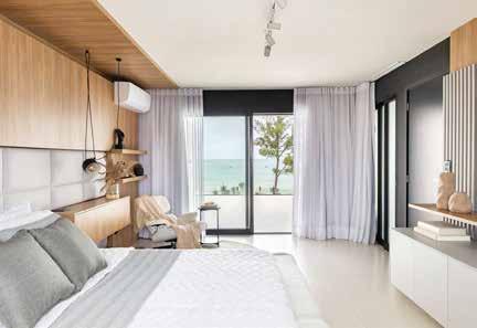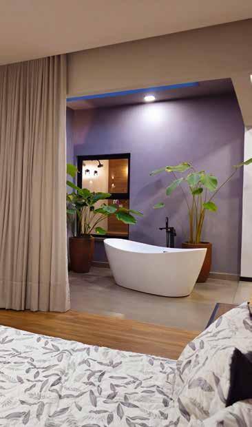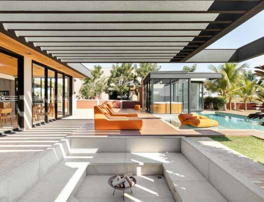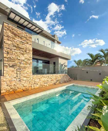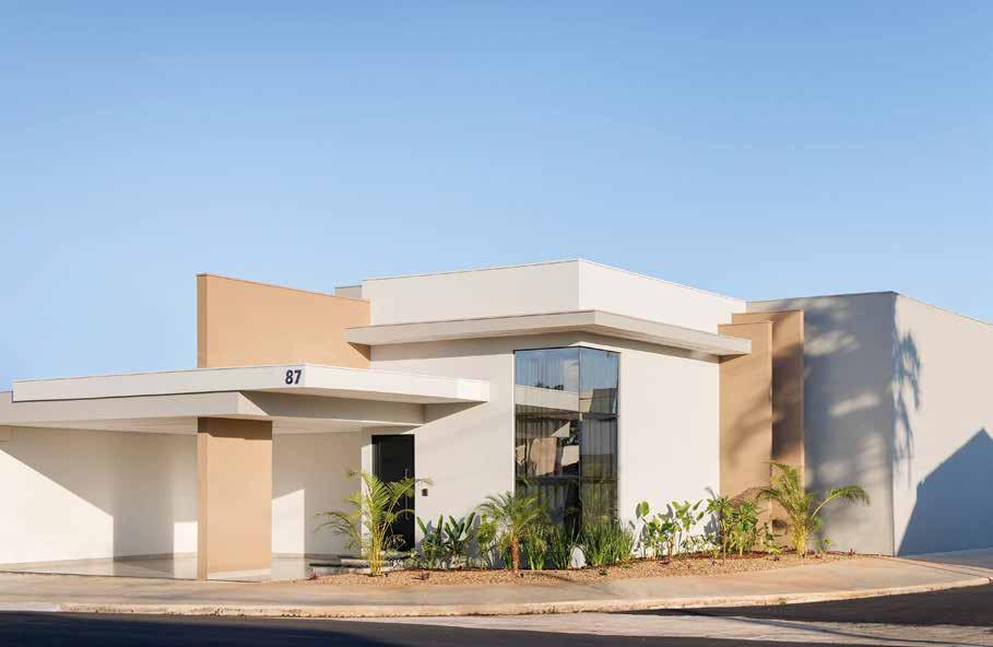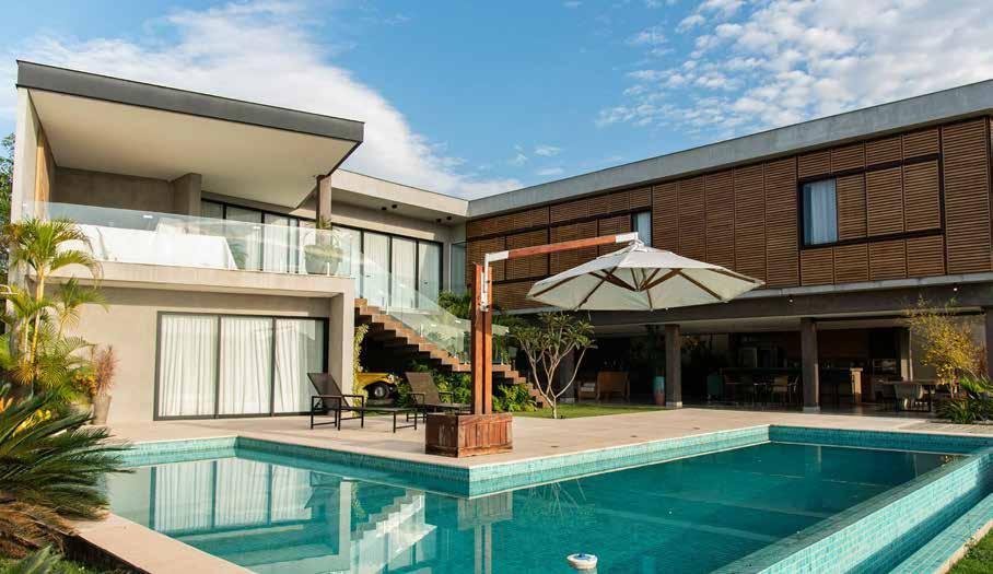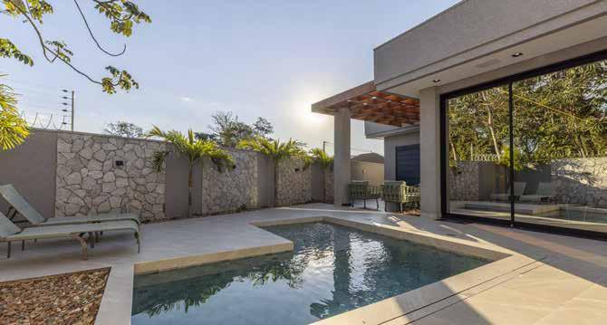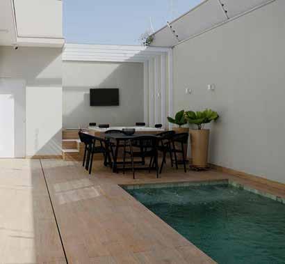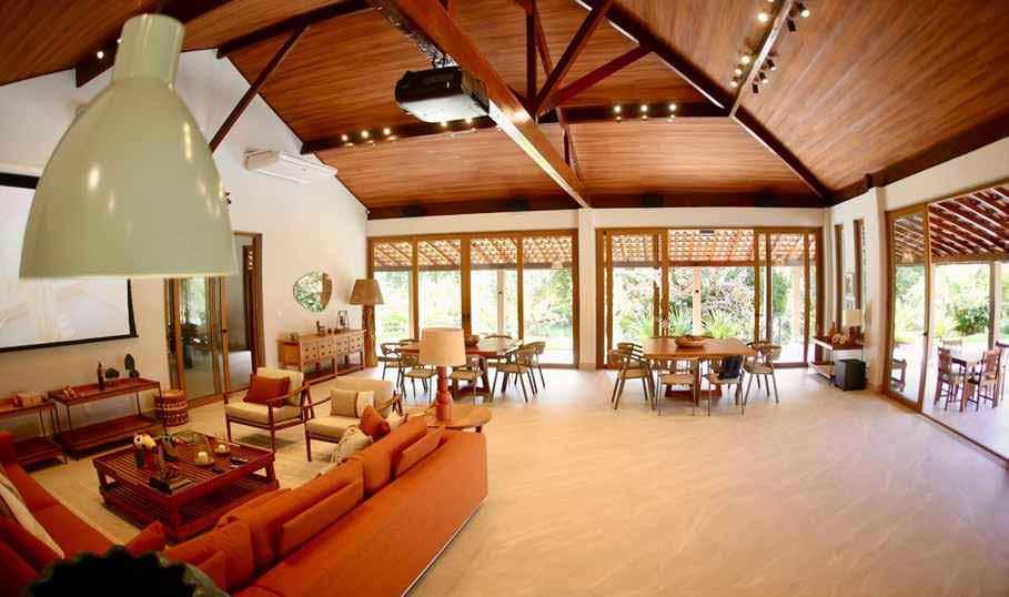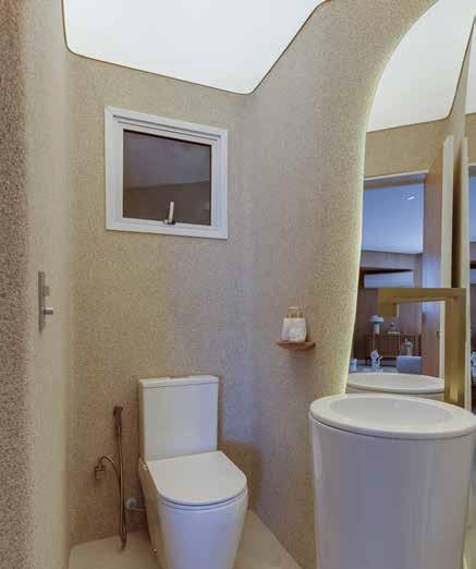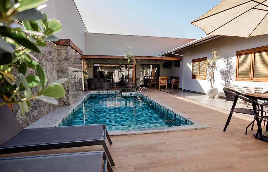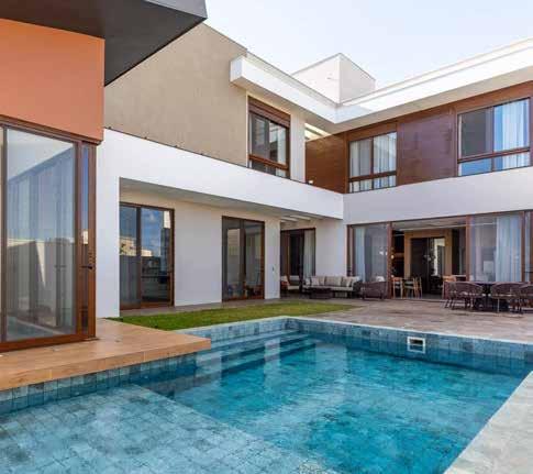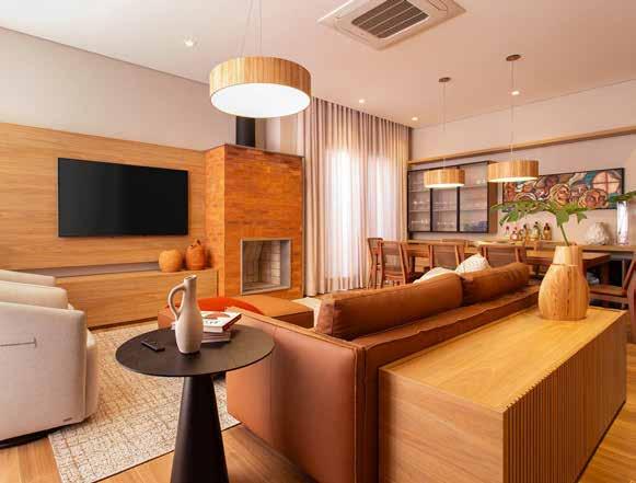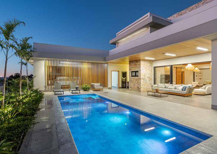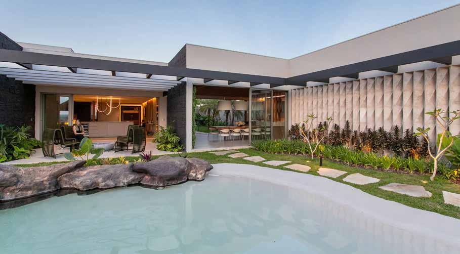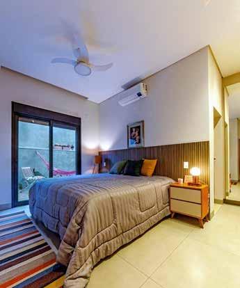 A paleta de cores aposta em tons quentes e intensos. O piso vinílico com textura amadeirada reveste toda a residência. A suíte master se conecta diretamente à piscina e ao jardim privativo. Com conceito de sala de banho, o banheiro tem banheira posicionada sob uma cobertura de vidro retrátil, vegetação natural e iluminação cênica, criando uma atmosfera de spa a céu aberto.