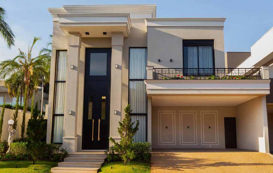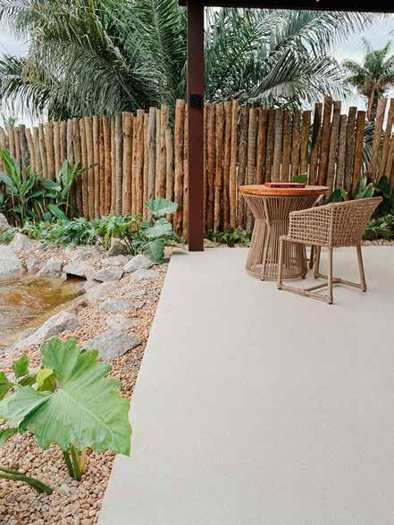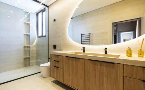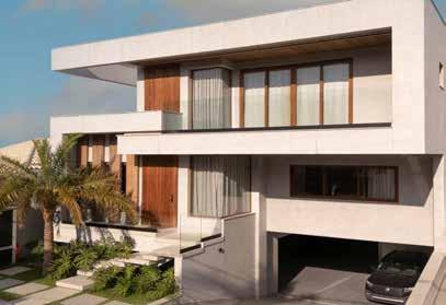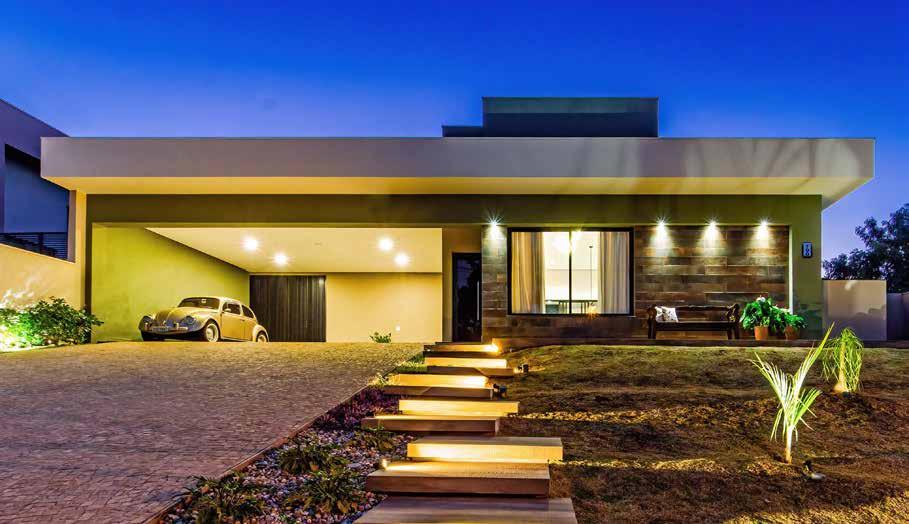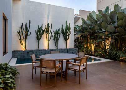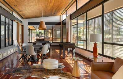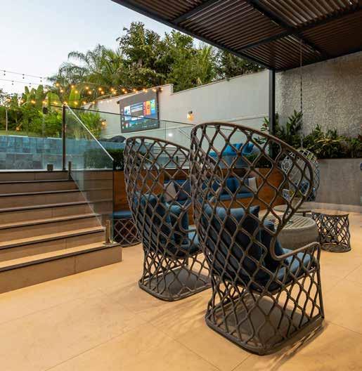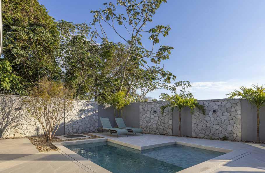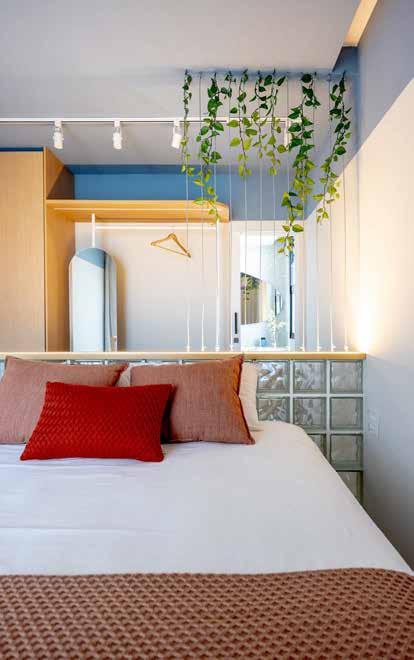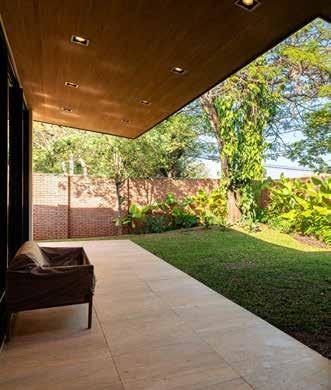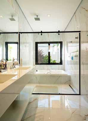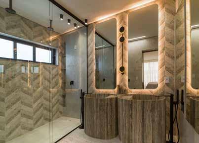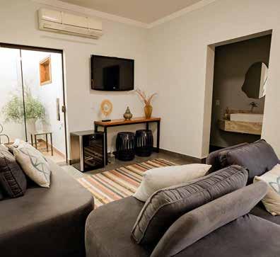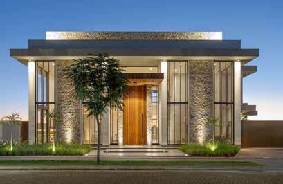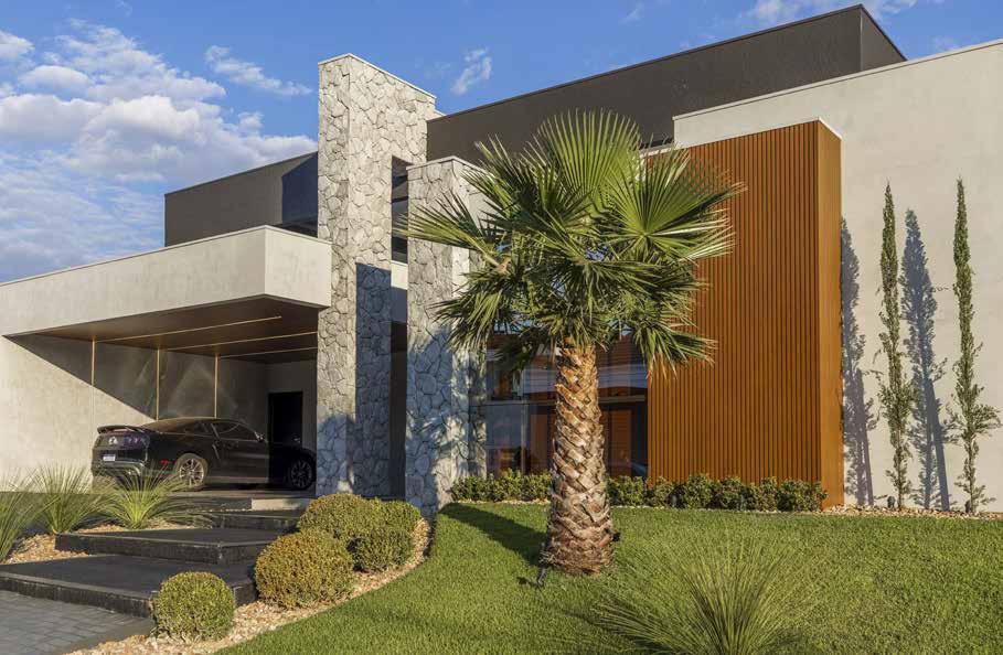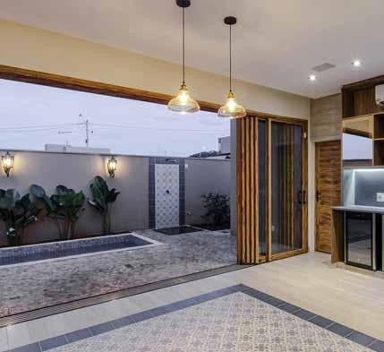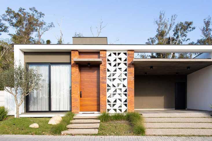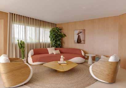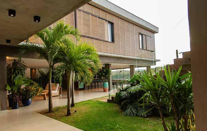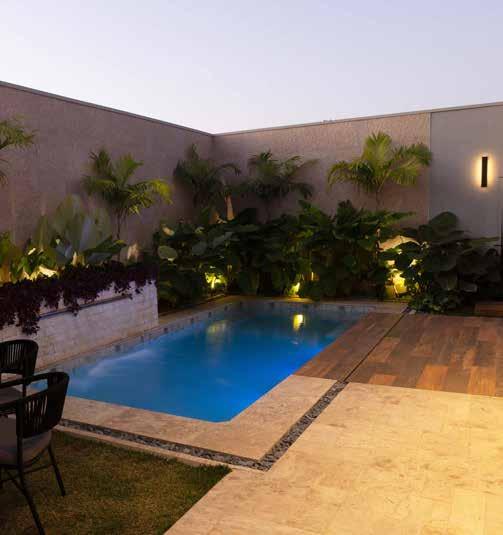 A paleta de cores aposta em tons quentes e intensos. O piso vinílico com textura amadeirada reveste toda a residência. A suíte master se conecta diretamente à piscina e ao jardim privativo. Com conceito de sala de banho, o banheiro tem banheira posicionada sob uma cobertura de vidro retrátil, vegetação natural e iluminação cênica, criando uma atmosfera de spa a céu aberto.