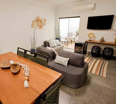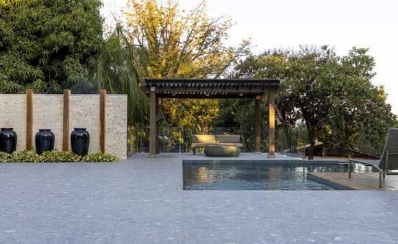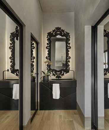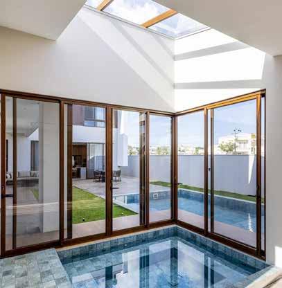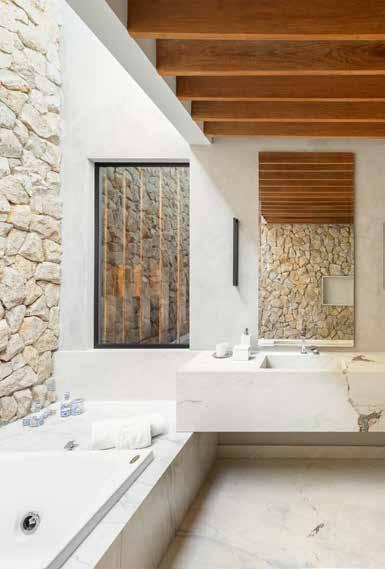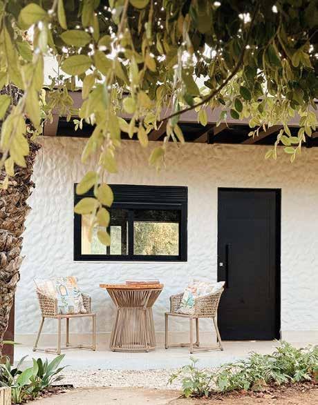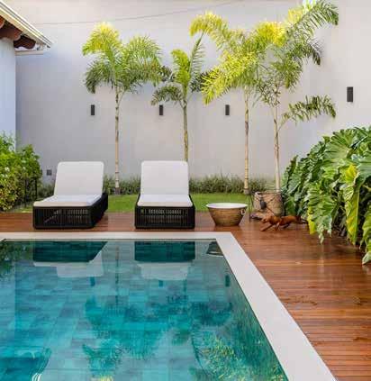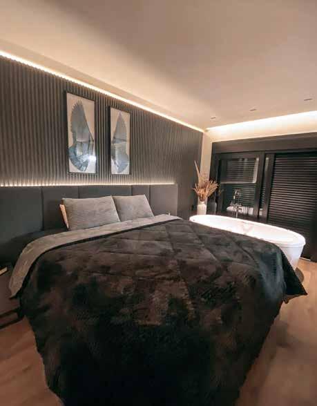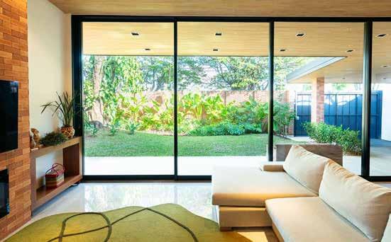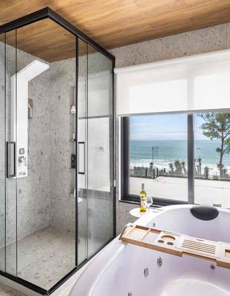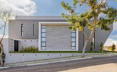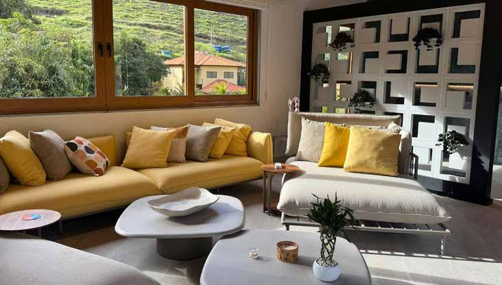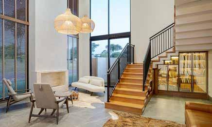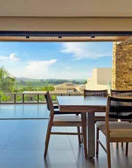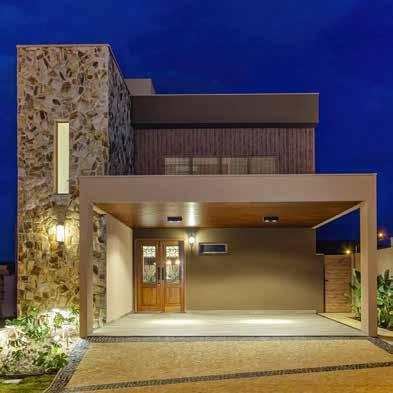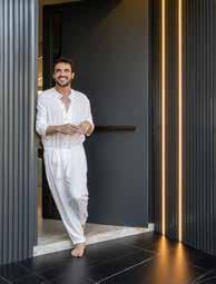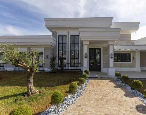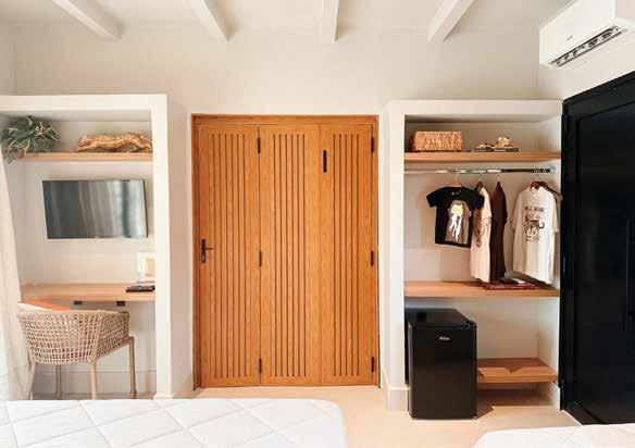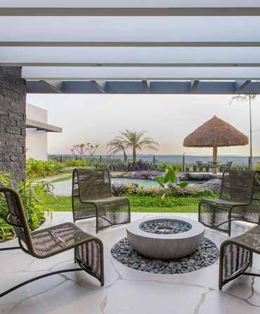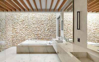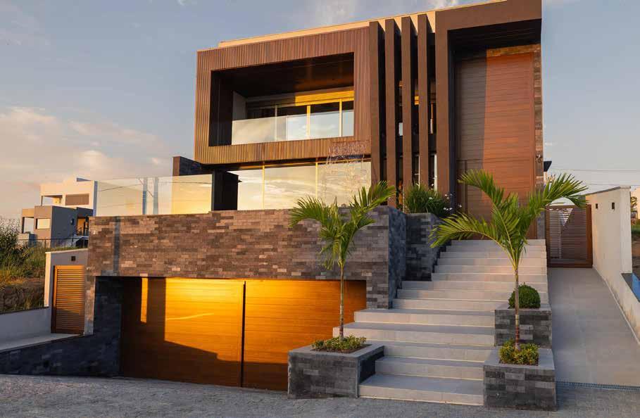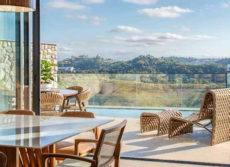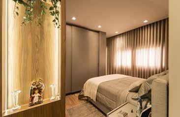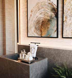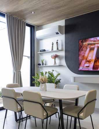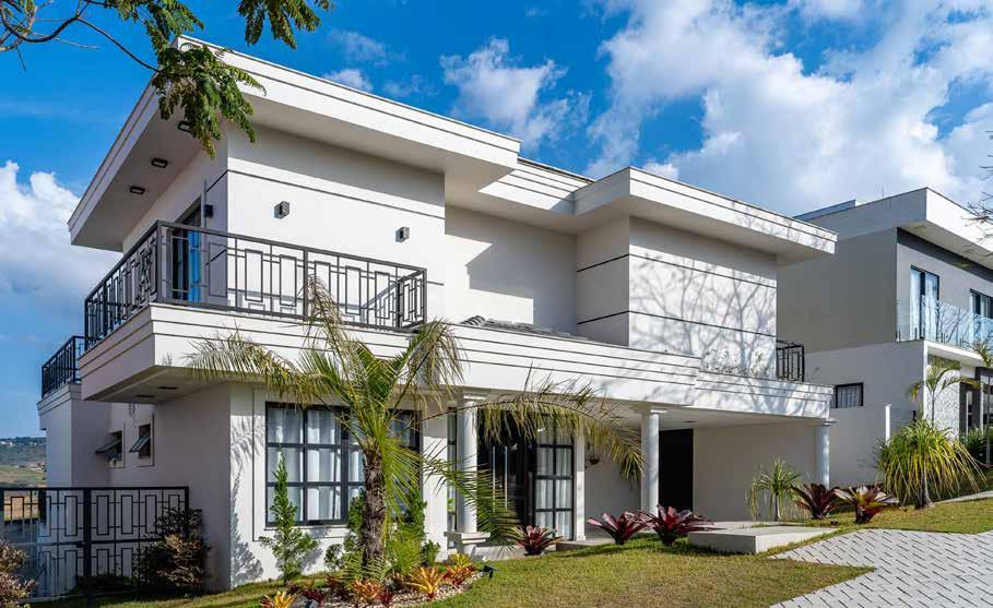 A paleta de cores aposta em tons quentes e intensos. O piso vinílico com textura amadeirada reveste toda a residência. A suíte master se conecta diretamente à piscina e ao jardim privativo. Com conceito de sala de banho, o banheiro tem banheira posicionada sob uma cobertura de vidro retrátil, vegetação natural e iluminação cênica, criando uma atmosfera de spa a céu aberto.
