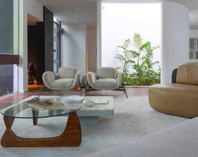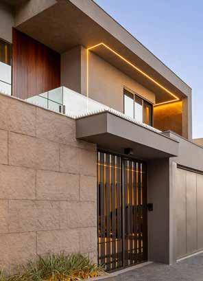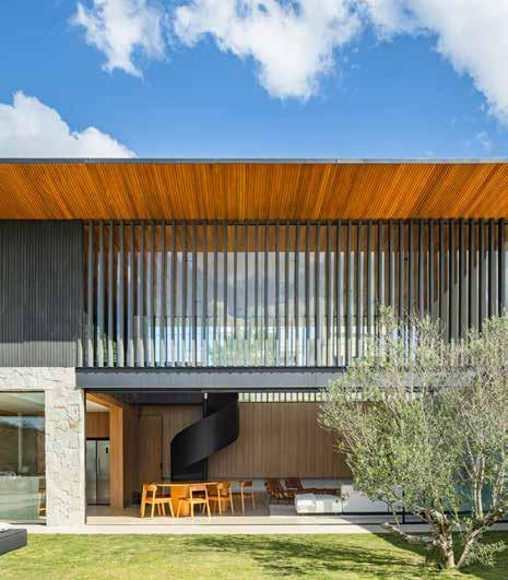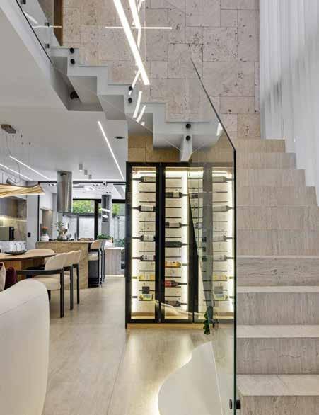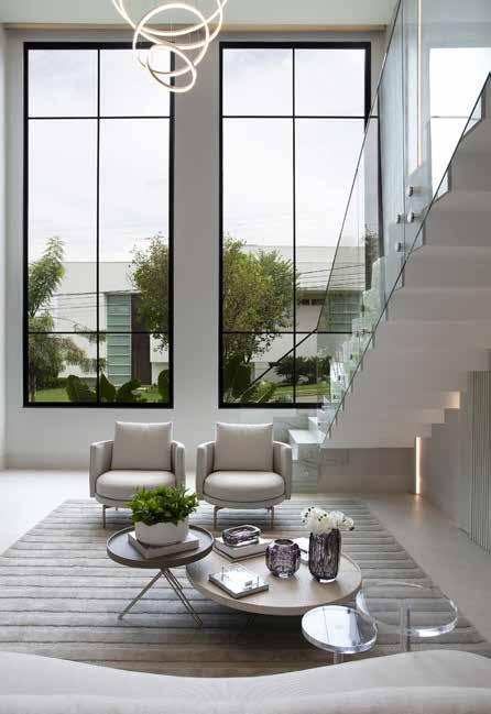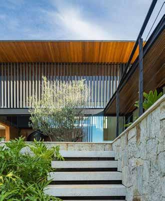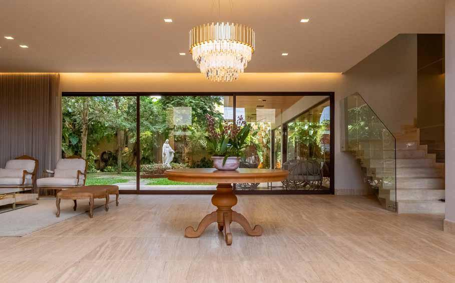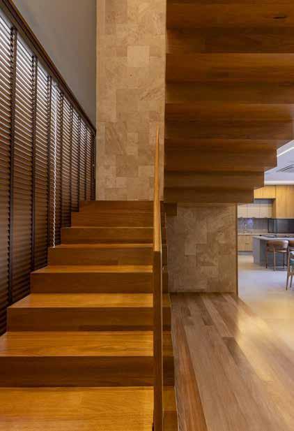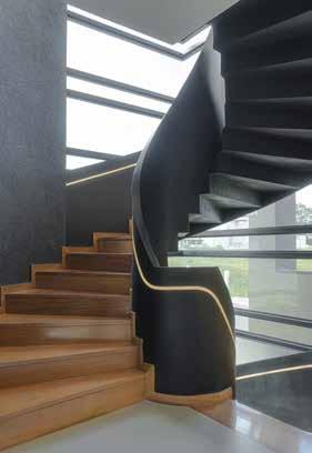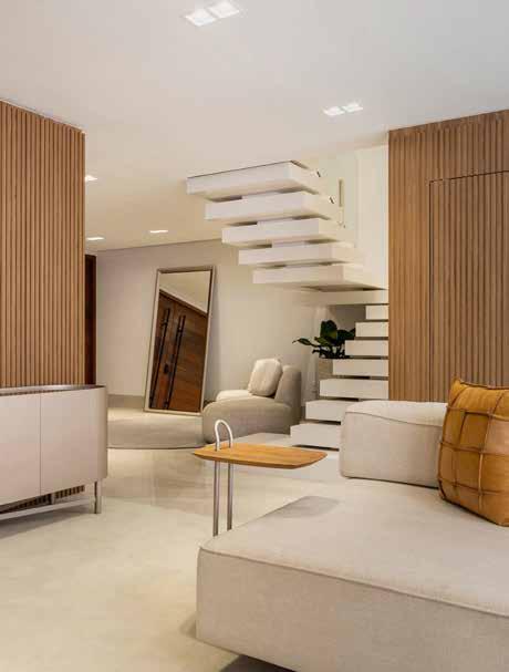 A escada do tipo cascata, com uma claraboia e revestida de mármore travertino, é um elemento de destaque. Internamente, os moradores podem contar com muita iluminação natural, ventilação inteligente e total privacidade, exatamente como desejavam. O projeto ganhou corpo respeitando plenamente os estilos e os gostos dos clientes, com conforto e sofisticação.
