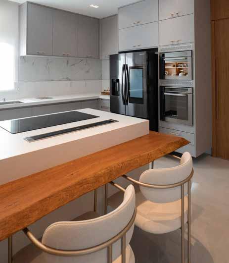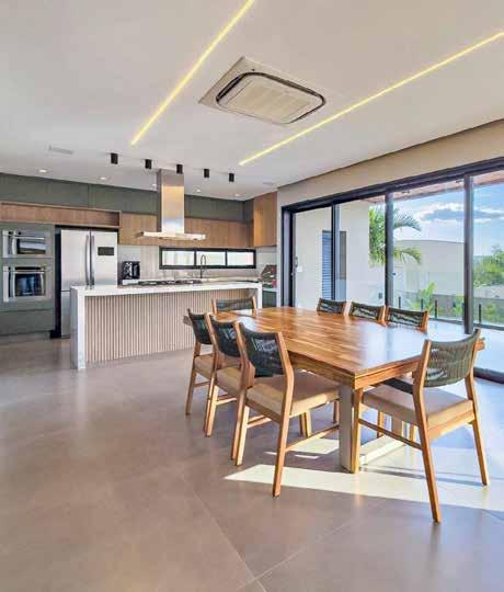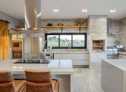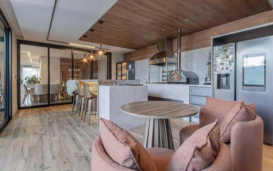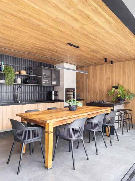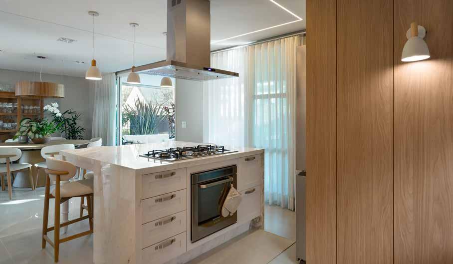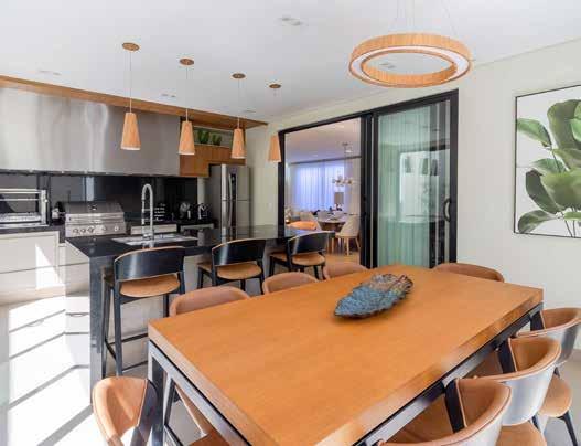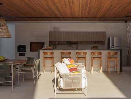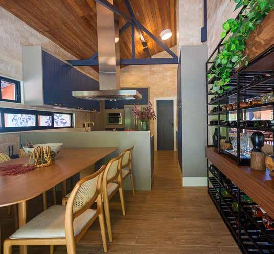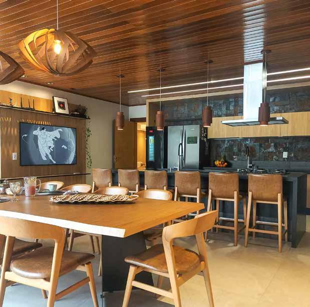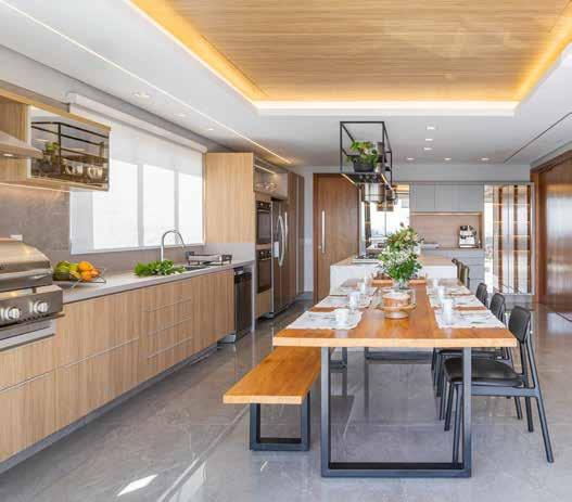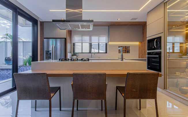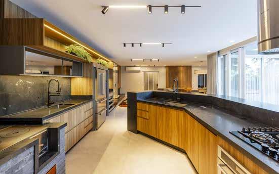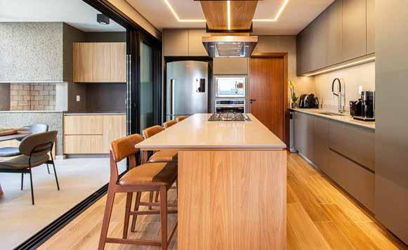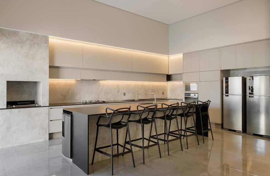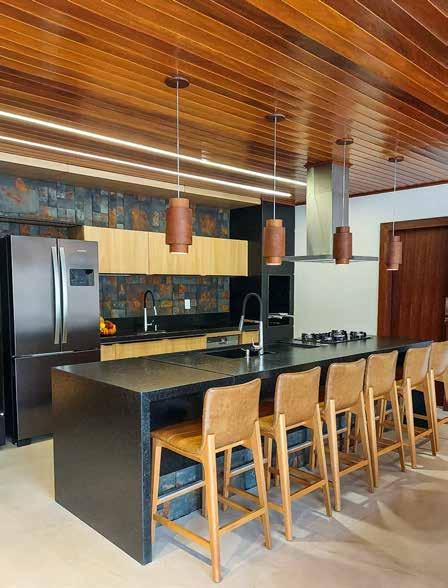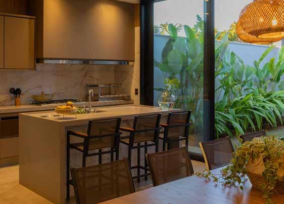CORAÇÃO PULSANTE DA CASA, A ÁREA GOURMET TEM UMA COMPOSIÇÃO QUE ALIA ELEGÂNCIA E FUNCIONALIDADE