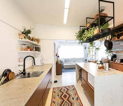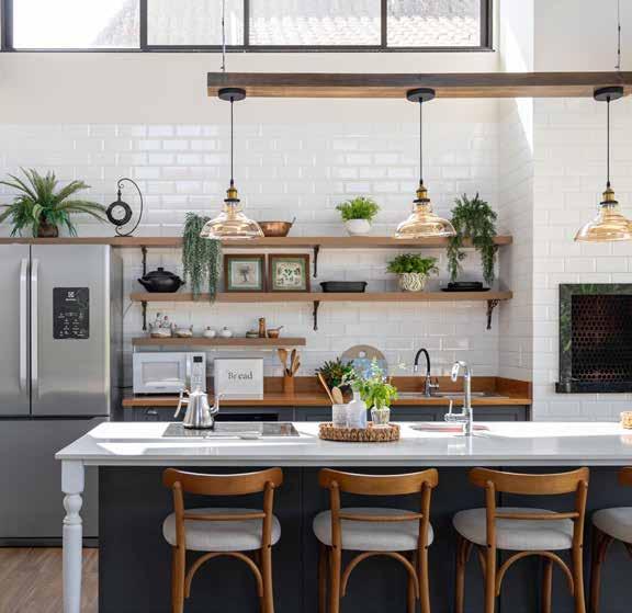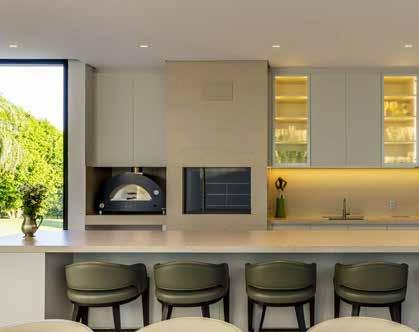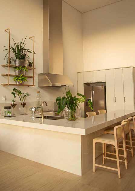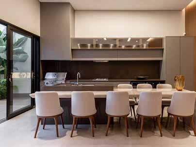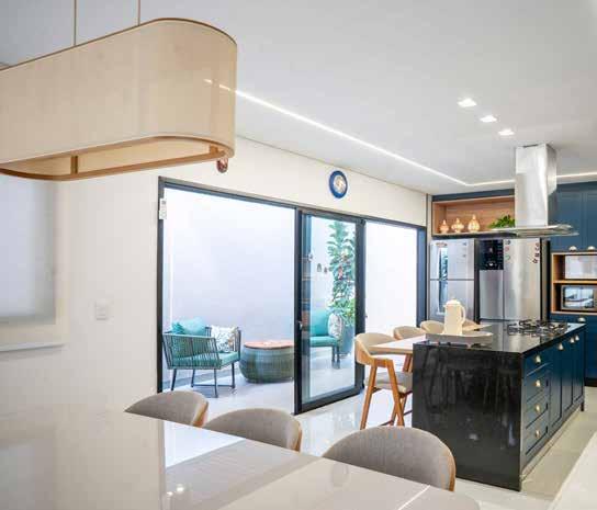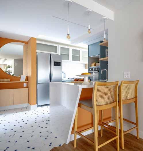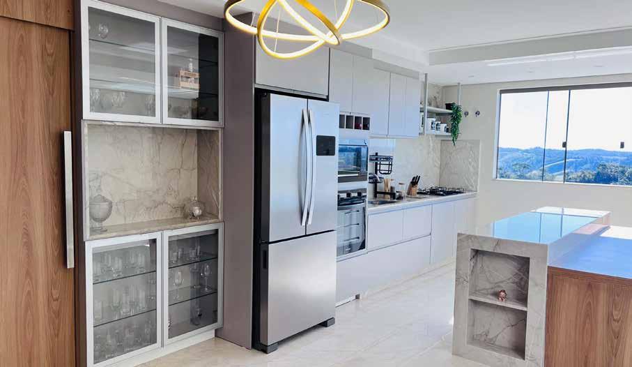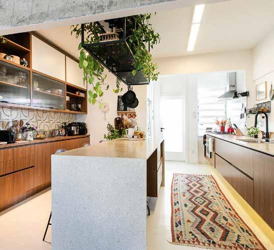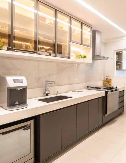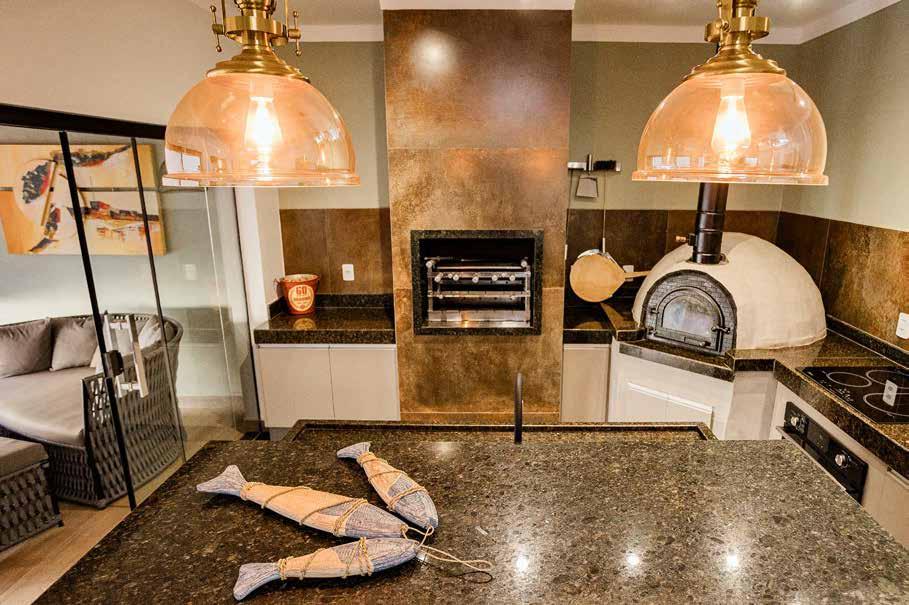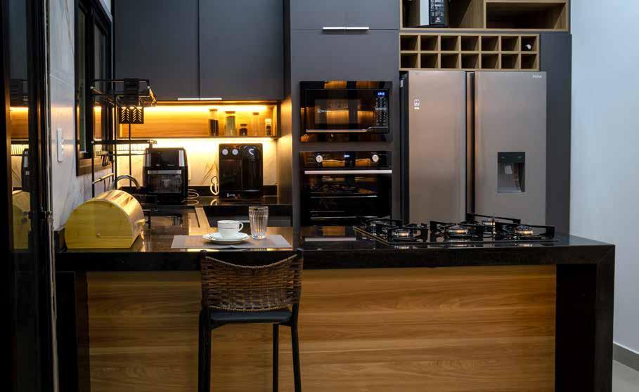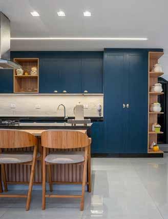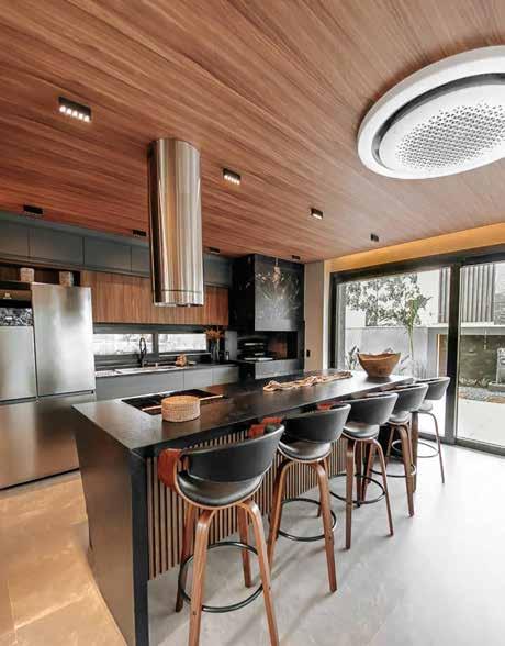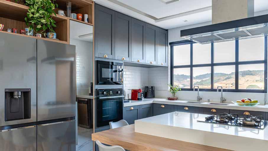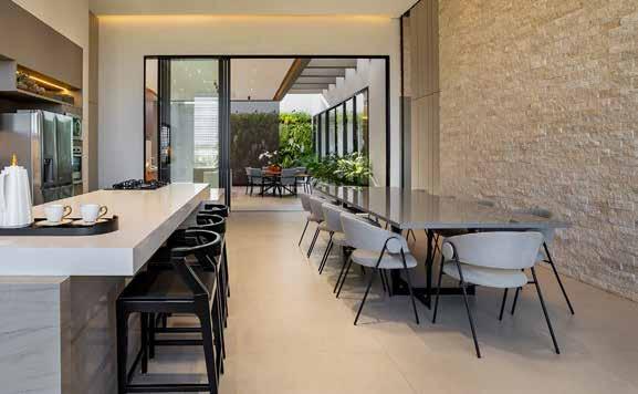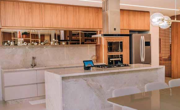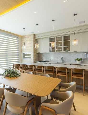 CORAÇÃO PULSANTE DA CASA, A ÁREA GOURMET TEM UMA COMPOSIÇÃO QUE ALIA ELEGÂNCIA E FUNCIONALIDADE