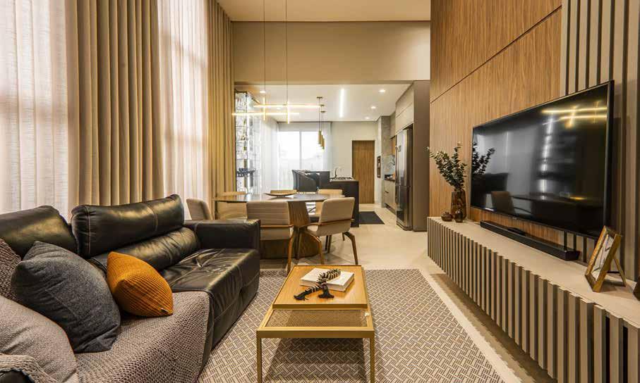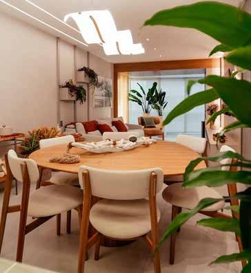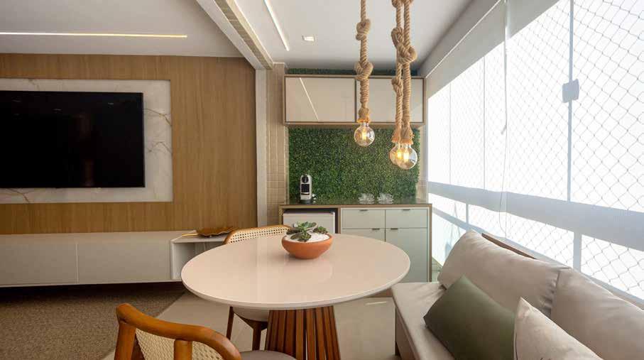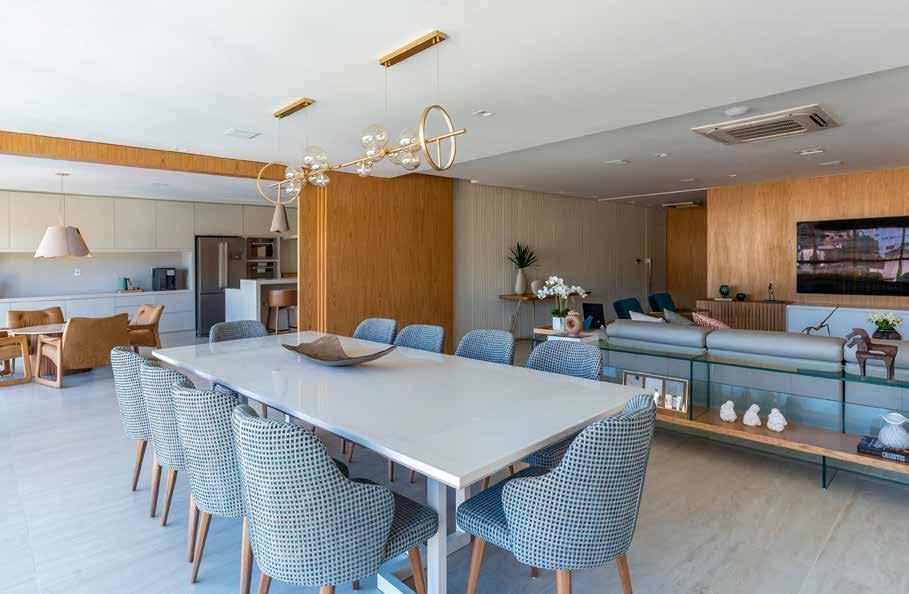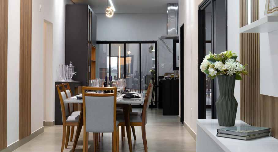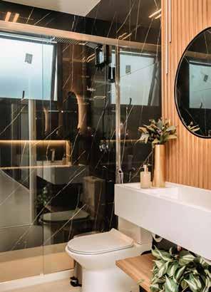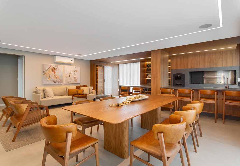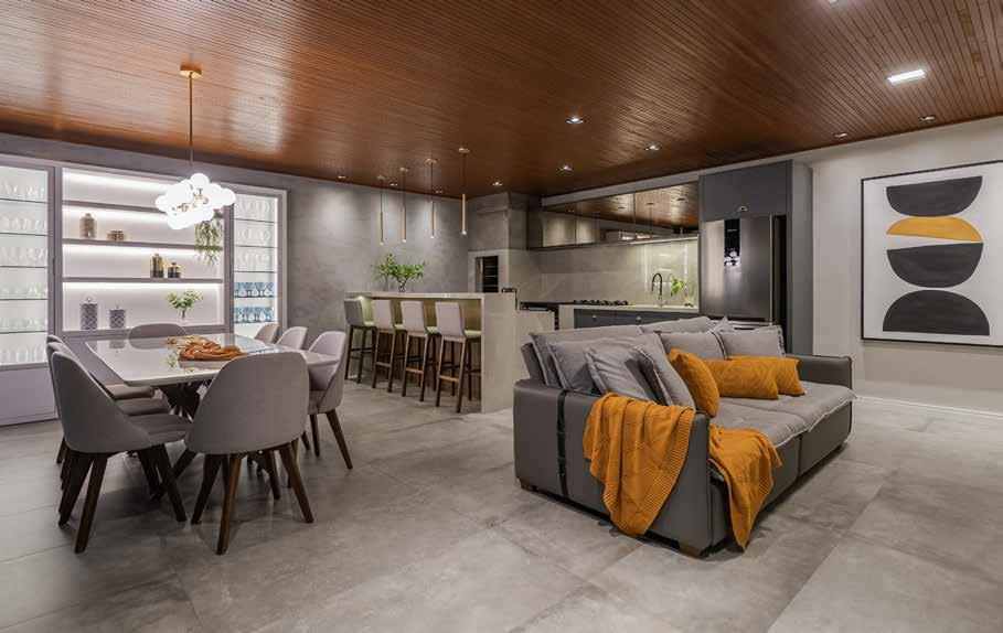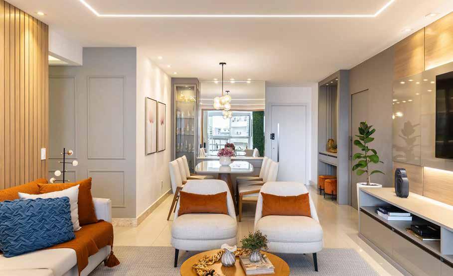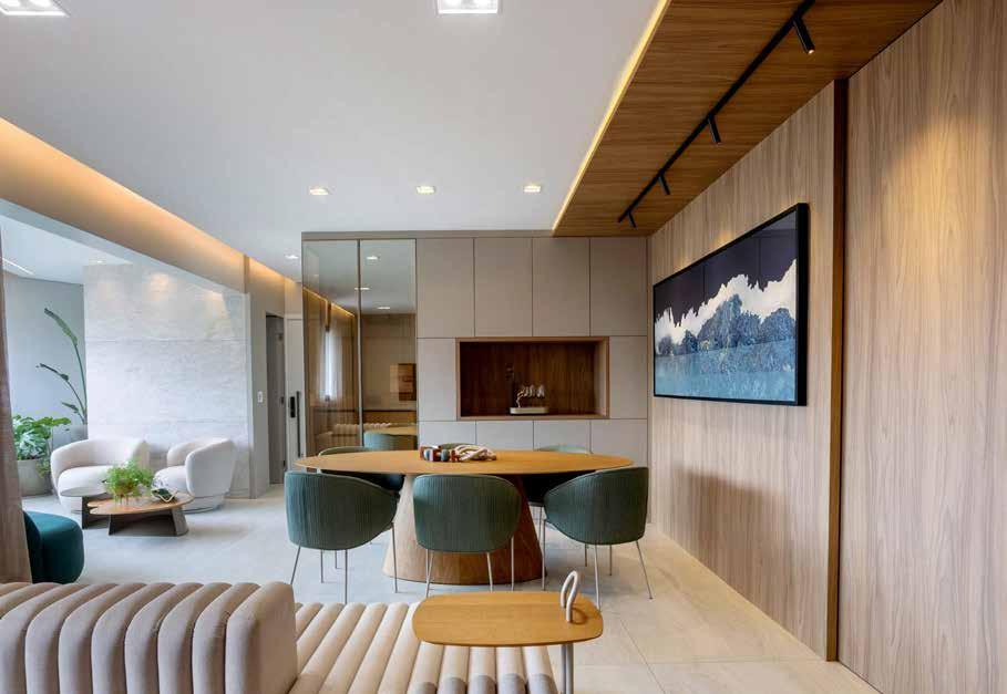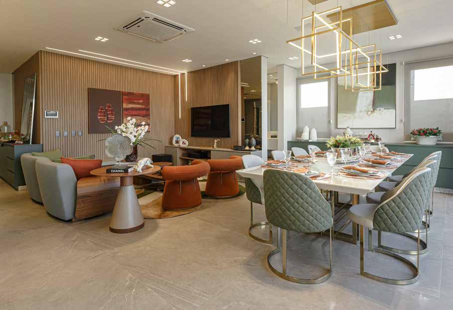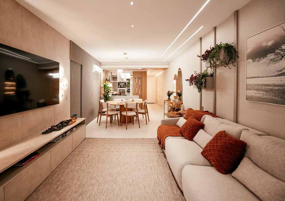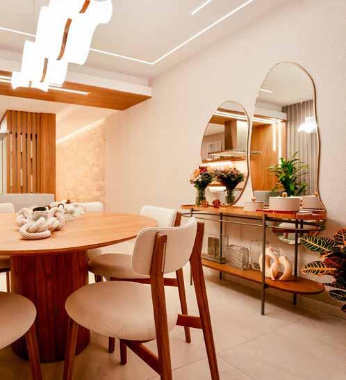Sala, cozinha e jantar se combinam em uma área única, projetada para receber bem. Os banheiros seguem a mesma linguagem: linhas limpas, revestimentos elegantes e iluminação natural, tudo para criar atmosferas calmas e funcionais.