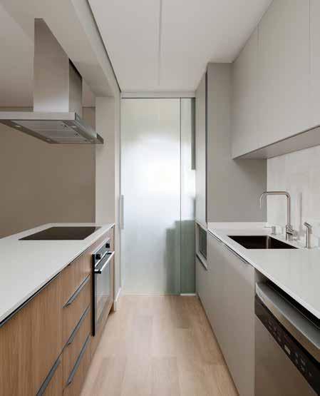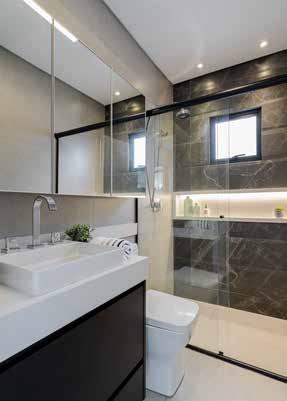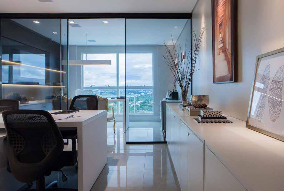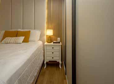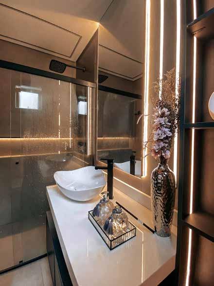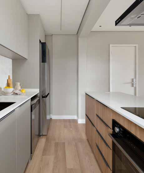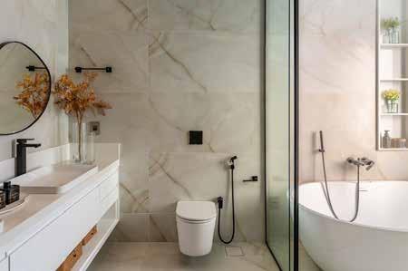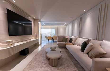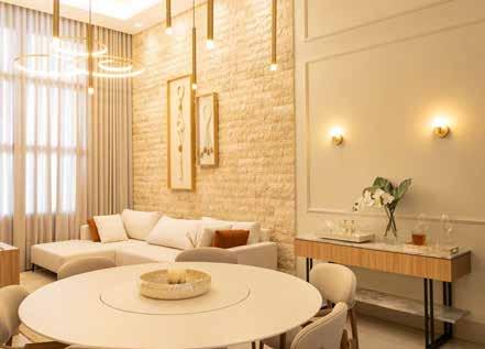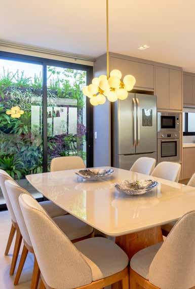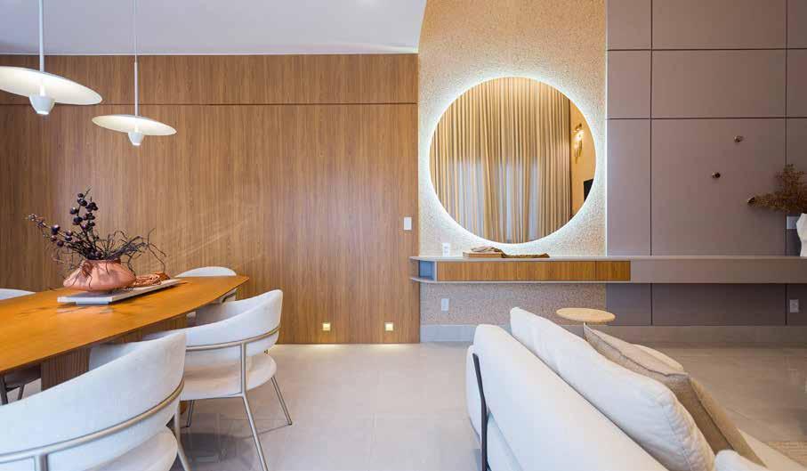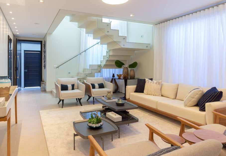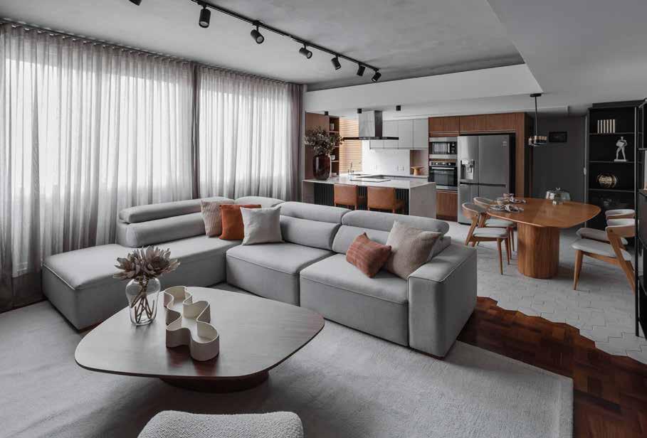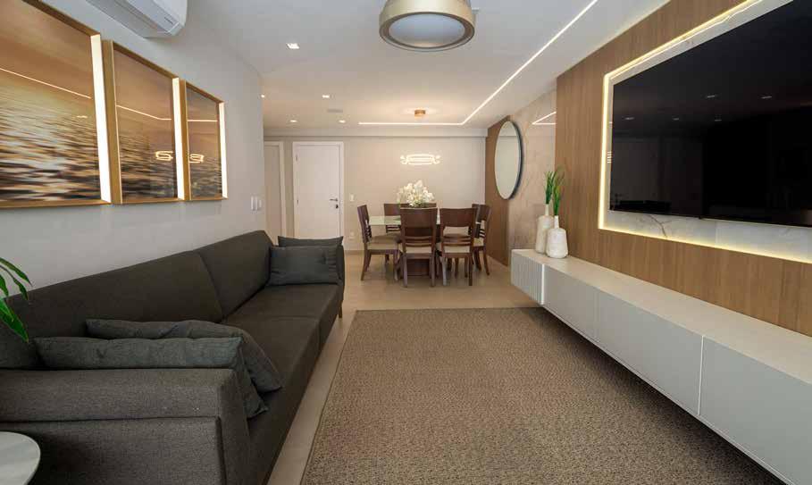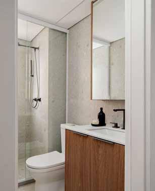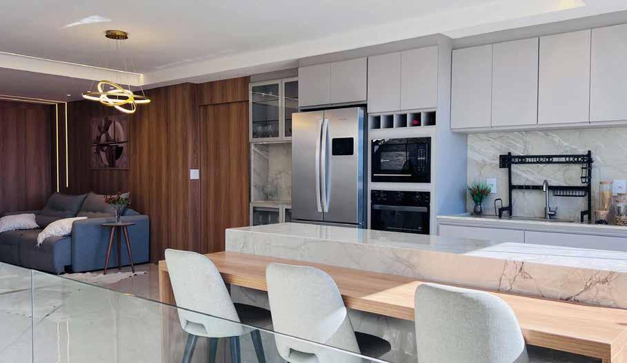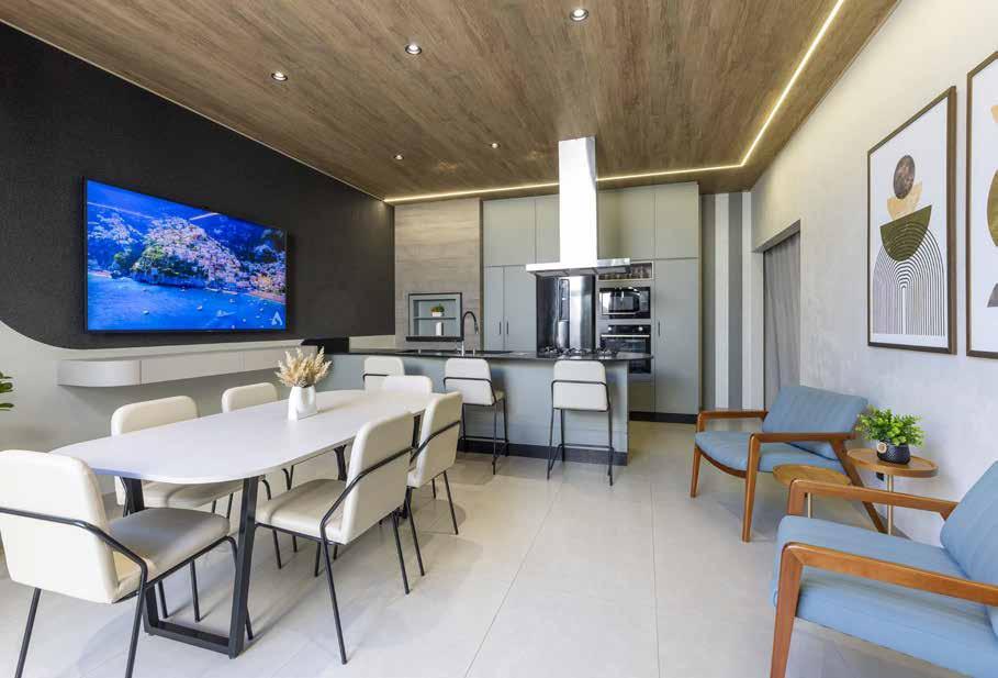 Sala, cozinha e jantar se combinam em uma área única, projetada para receber bem. Os banheiros seguem a mesma linguagem: linhas limpas, revestimentos elegantes e iluminação natural, tudo para criar atmosferas calmas e funcionais.