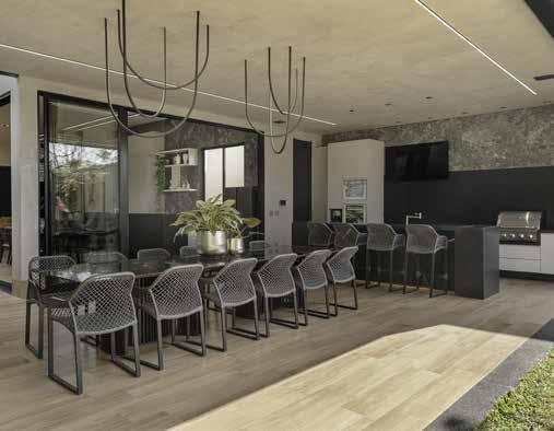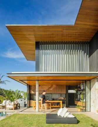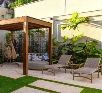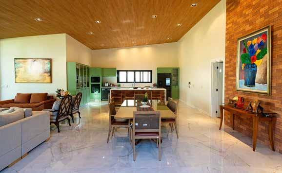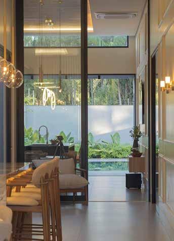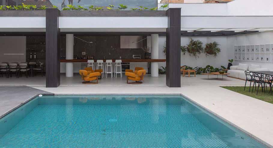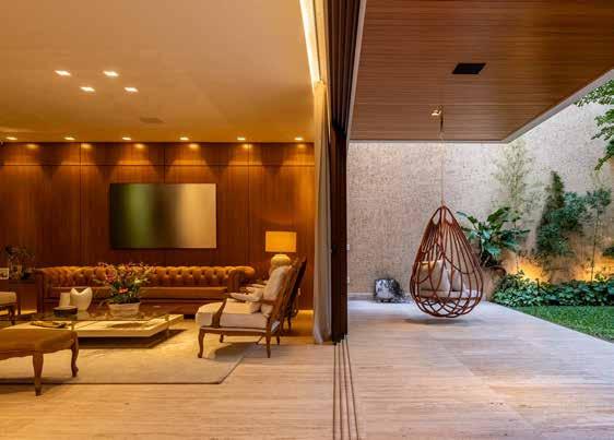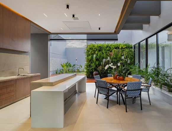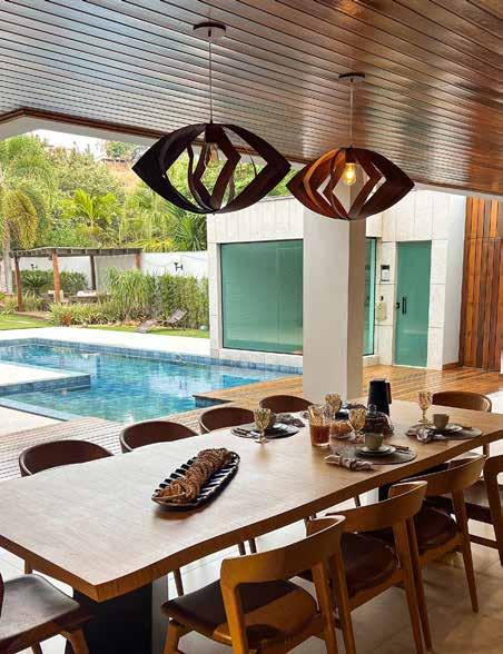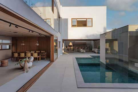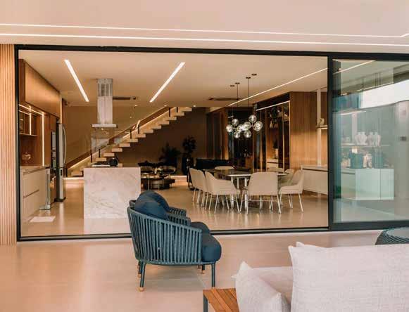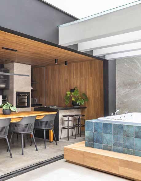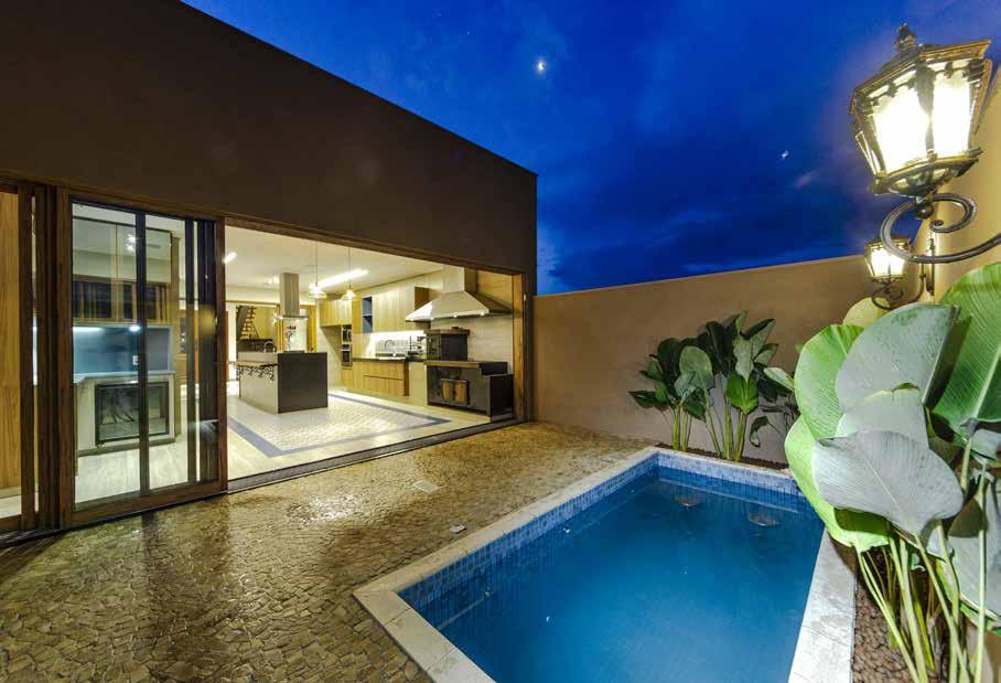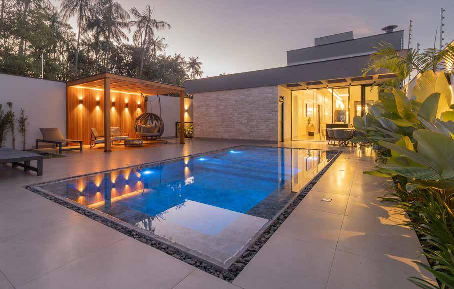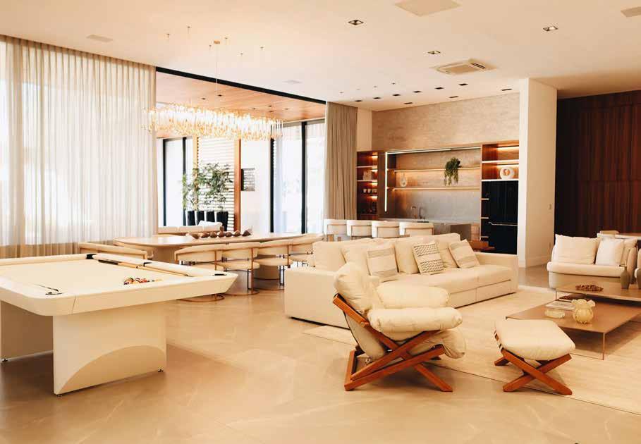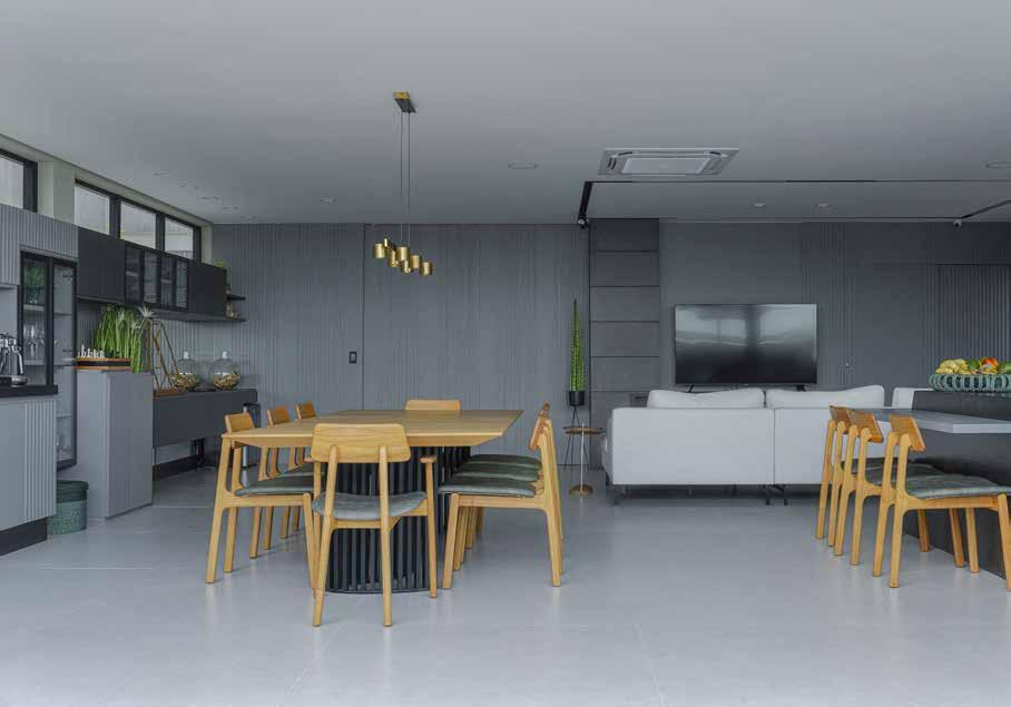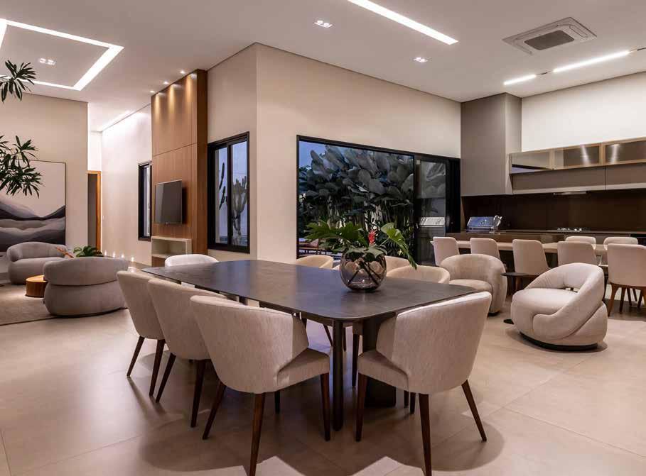 Sala, área gourmet, lazer e jardim são integrados. Na área externa, o paisagismo envolve a piscina, enquanto a iluminação indireta valoriza as texturas dos revestimentos e o verde. Na área gourmet, a extensa bancada em tom escuro, a mesa de bilhar conversível em mesa de jan-
