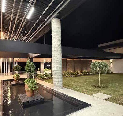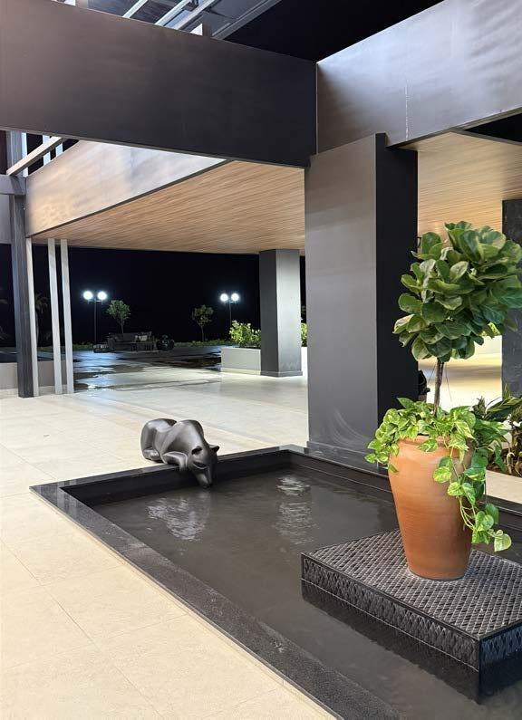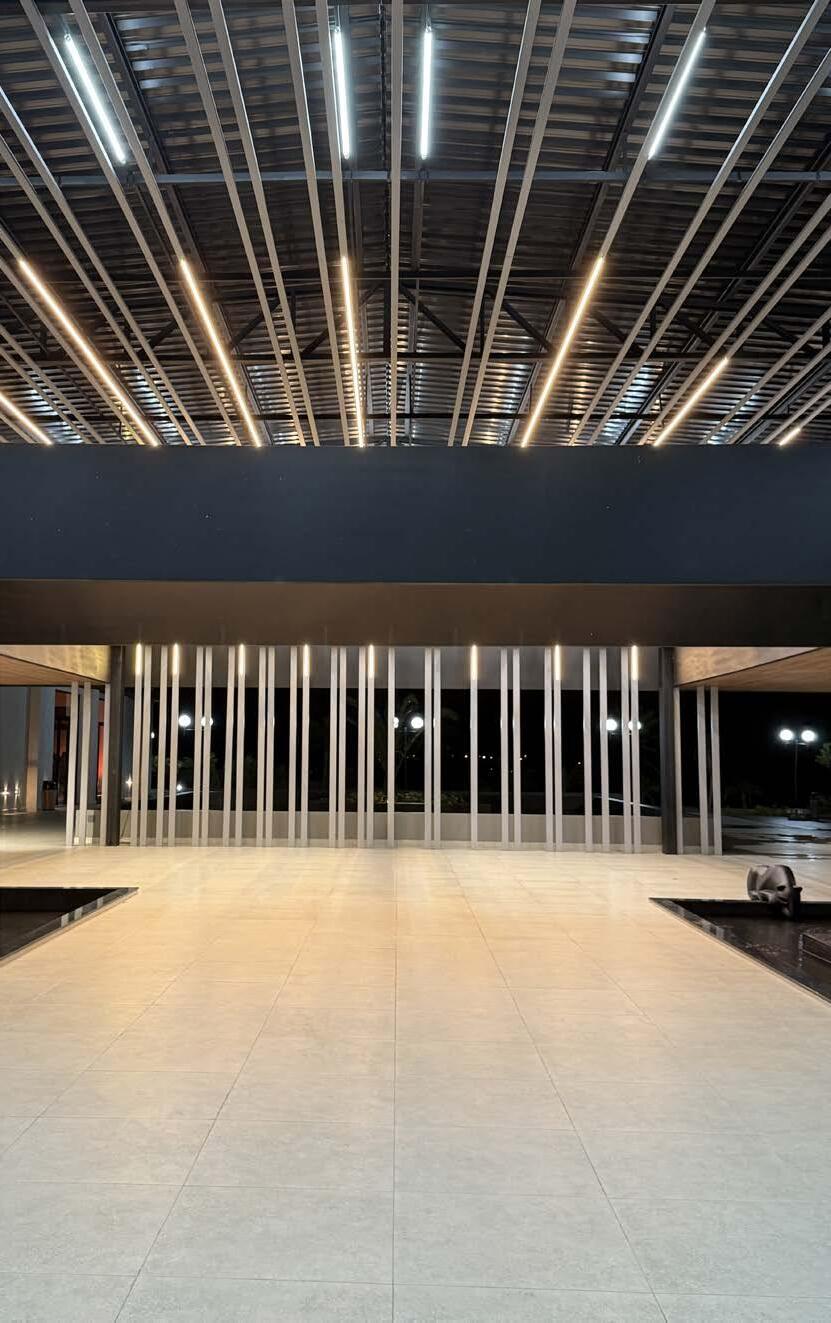 Uma iluminação retilínea que demarca o caminho a ser seguido é destaque na ampla cobertura da entrada, cujo pé-direito atinge 5 metros. Abaixo dela, os espelhos d’água têm papel importante no efeito. O grande hall conecta os espaços do salão de festas e da capela.