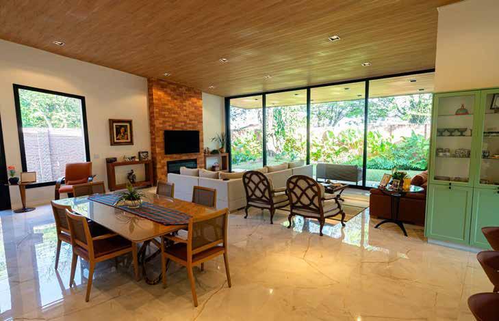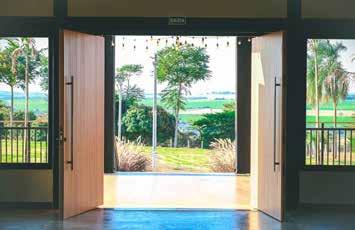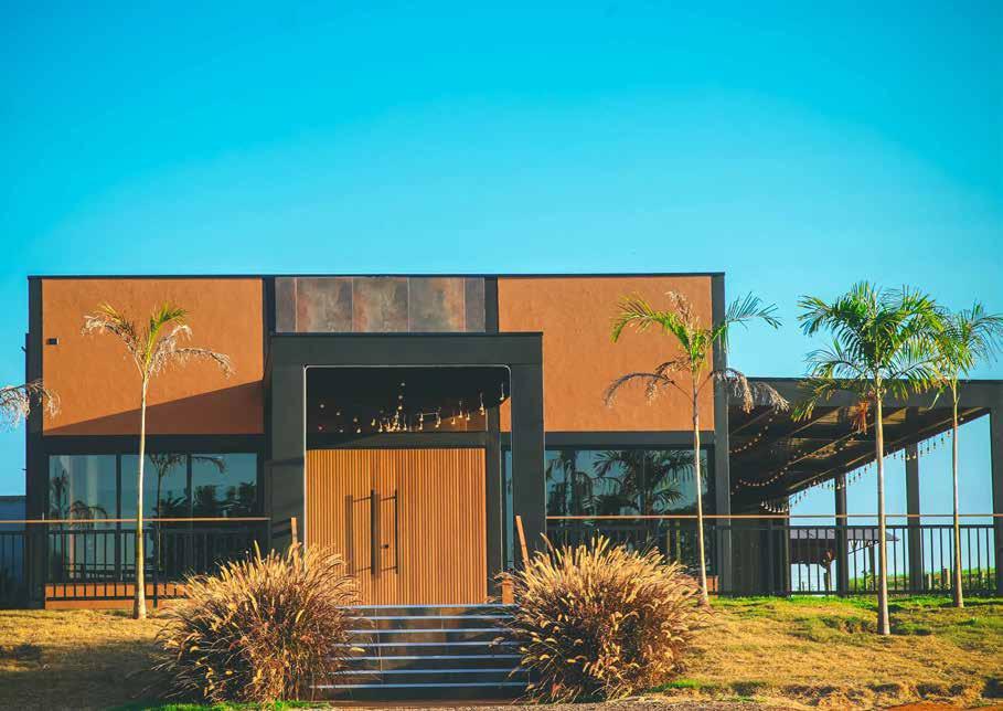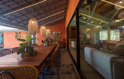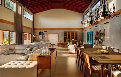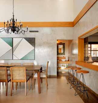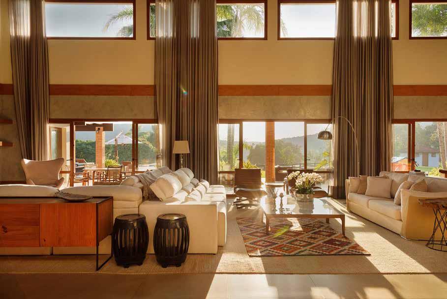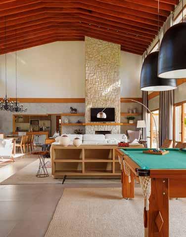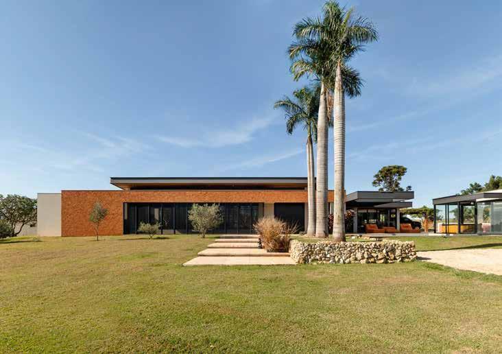 Diversas tonalidades de verde da paisagem ao redor emolduram este projeto que entrega ambientes para lazer, encontros privados e contemplação. O elo mais forte entre arquitetura e natureza está nas grandes superfícies envidraçadas, que dissolvem as barreiras entre o construído e o natural, permitindo que o externo invada o interior de forma generosa e contínua. O espaço revelou uma vocação – cenário perfeito para grandes celebrações – e se tornou também salão de eventos. Uma ambientação rústica, descontraída e afetuosa dá identidade única ao projeto. Destacam-se o tijolo maciço aparente, o cimento queimado e uma paleta de tons terrosos. A dualidade entre o acolhimento íntimo e a escala dos eventos resume o resultado.