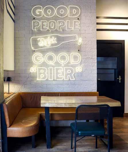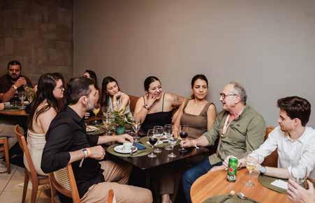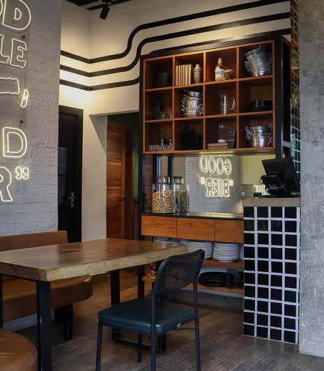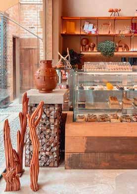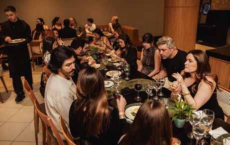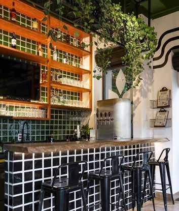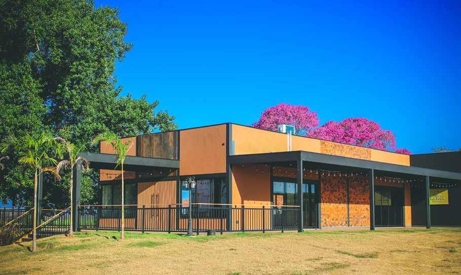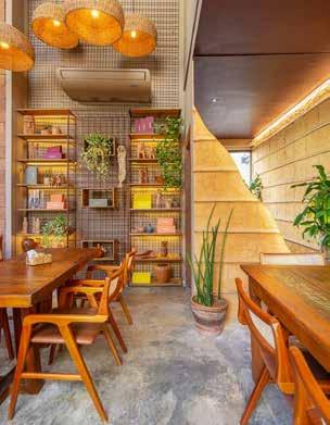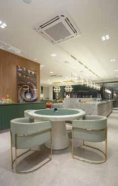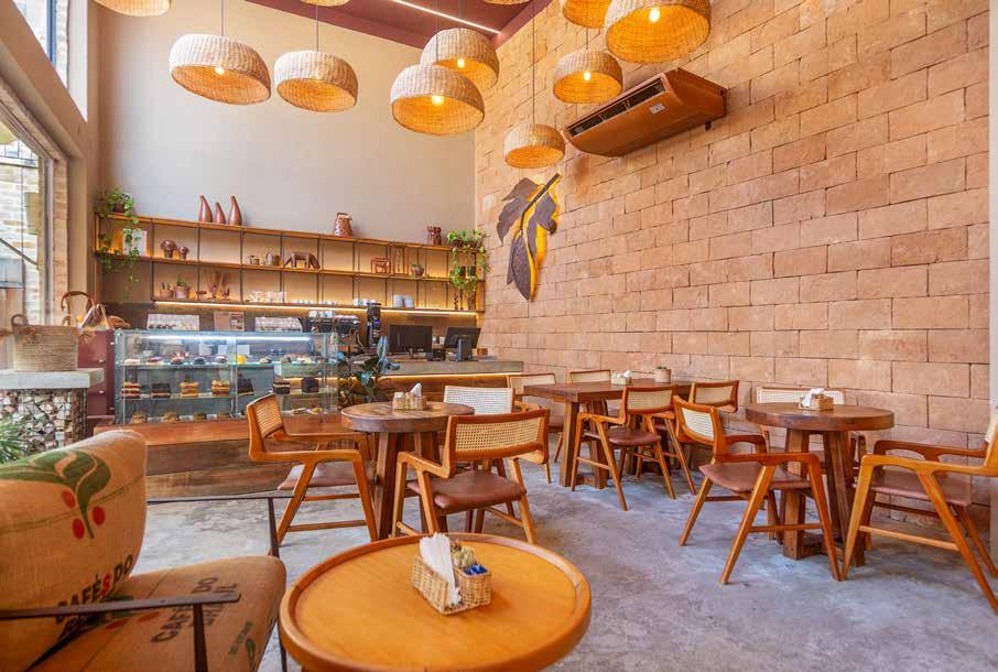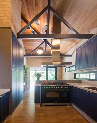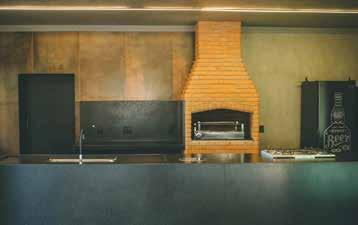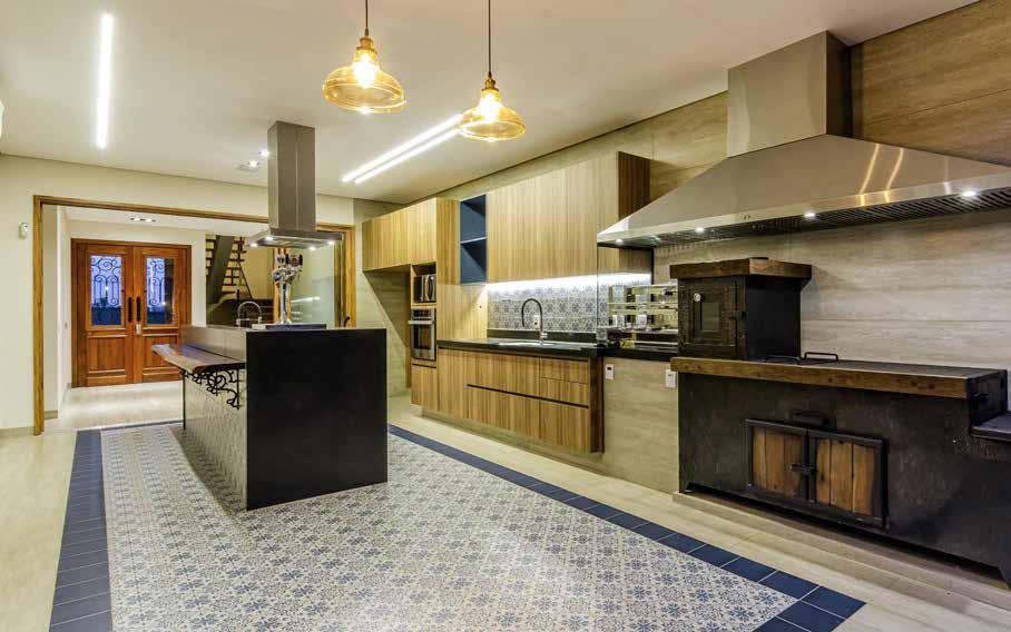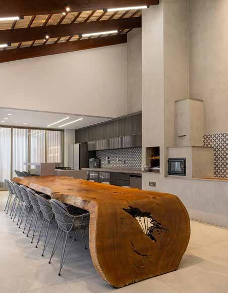 Ganha destaque a cozinha gourmet, equipada com chopeiras, cervejeiras, balcões refrigerados, forno e fogão a lenha, cooktop e fornos especiais. O fogão a lenha em ferro fundido com dormentes e a porta principal em madeira maciça, produzida por artesãos mineiros, dão identidade ao projeto e estabelecem diálogo entre a tradição construtiva brasileira e a arquitetura contemporânea.