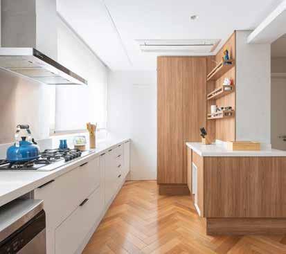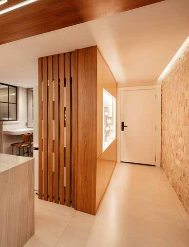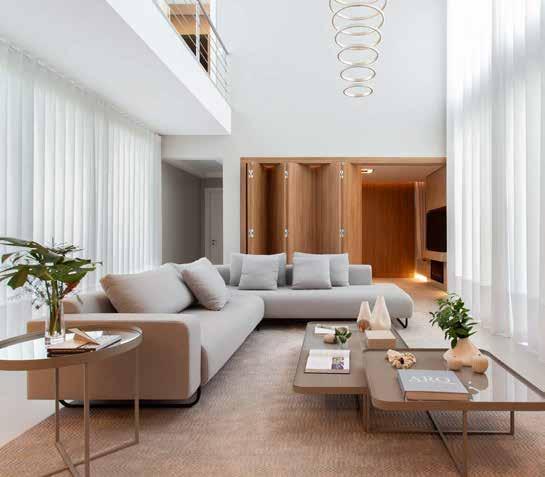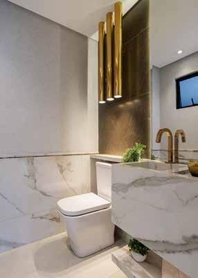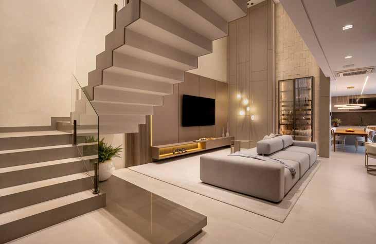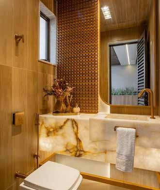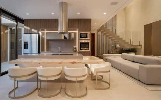 A sala com pé-direito duplo e mezanino é o ponto de partida deste projeto, que combina integração, funcionalidade e elegância. A iluminação marcante e o uso do porcelanato polido em toda a área social garantem uniformidade e sofisticação ao espaço. Um painel ripado camufla o lavabo, no coração da casa. É destaque neste espaço o uso de materiais nobres: a bancada com cuba esculpida oculta em ônix iluminado, metais dourados e revestimentos em porcelanato polido off-white. Na cozinha, a bancada em Nanoglass se alia à marcenaria clara e ao mesmo porcelanato aplicado em piso e paredes.