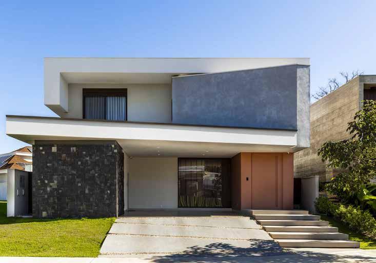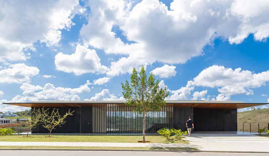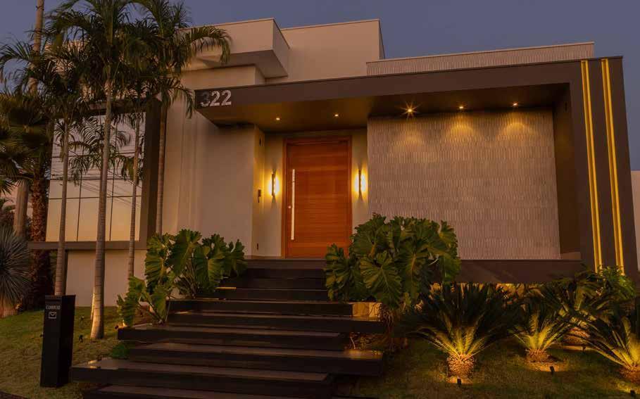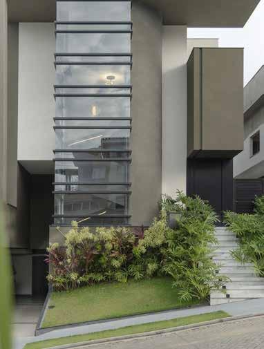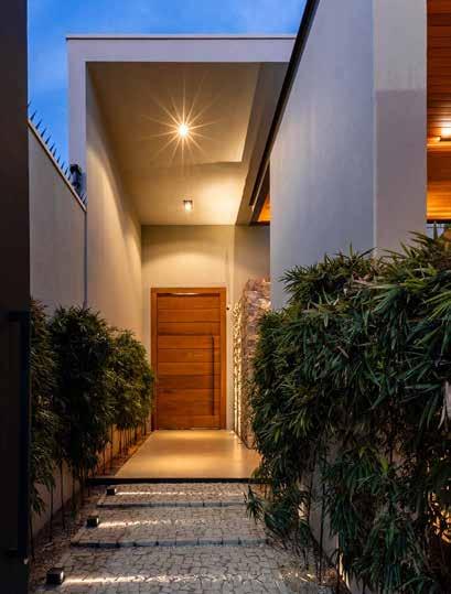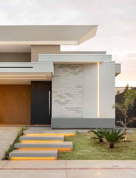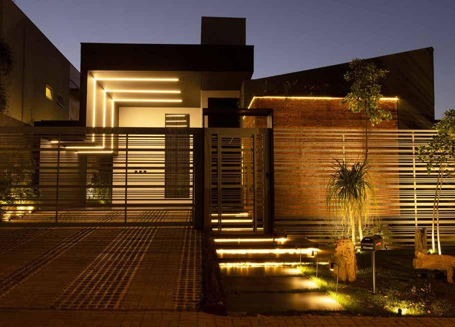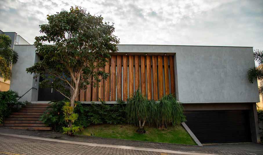 Com volumes limpos, linhas retas e paisagismo como moldura, este projeto se revela uma leitura contemporânea da arquitetura brasileira. A topografia do terreno de 472,60 m² abriu caminho para a criação de degraus na fachada. O pano de vidro permite que a luz natural se espalhe pelo interior da casa, ao mesmo tempo que amplia o contato com o entorno. A presença da madeira aquece os ambientes com naturalidade, enquanto a iluminação pontual cria um delicado jogo de luz e sombra.