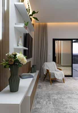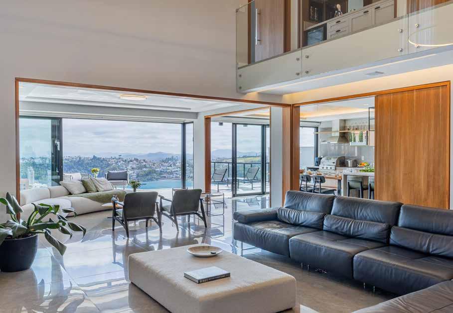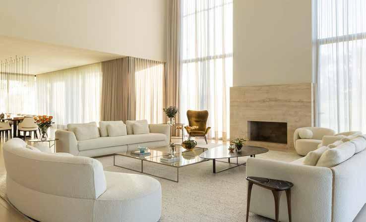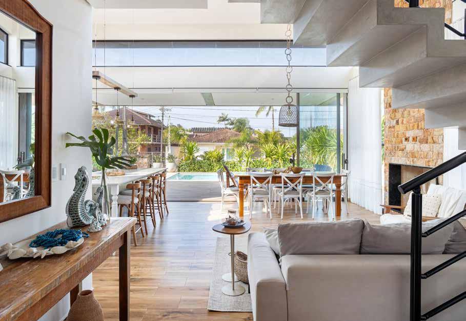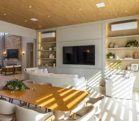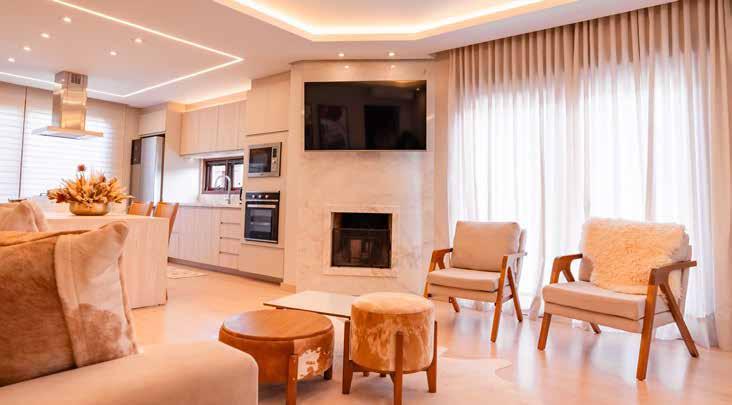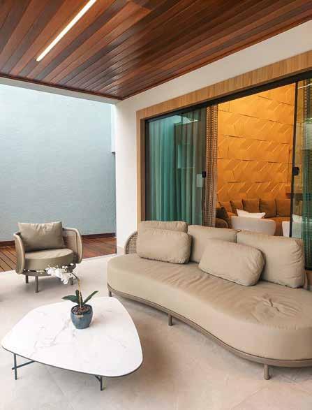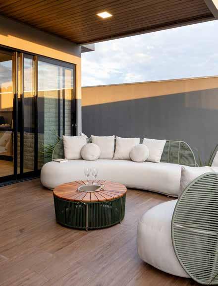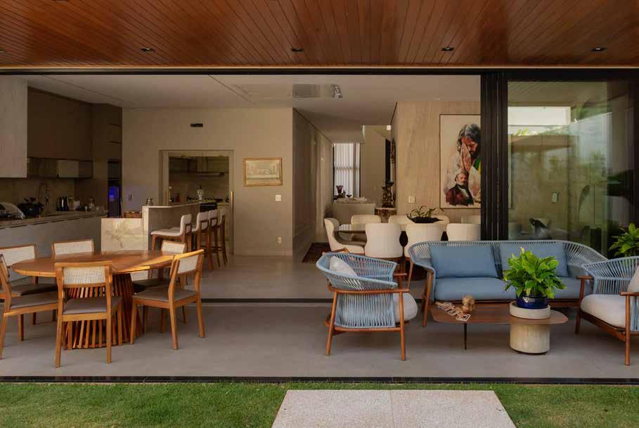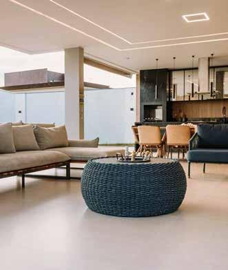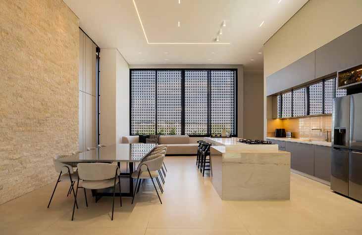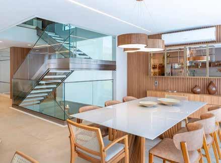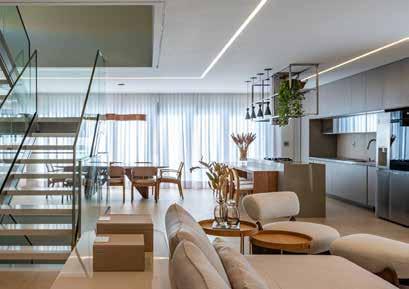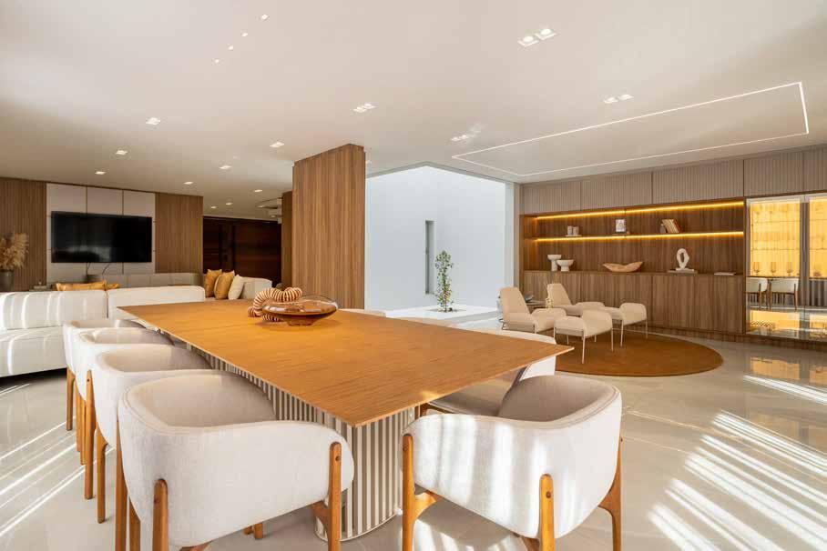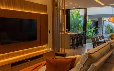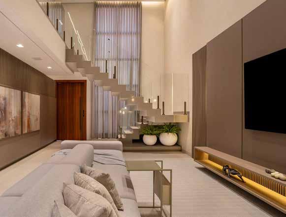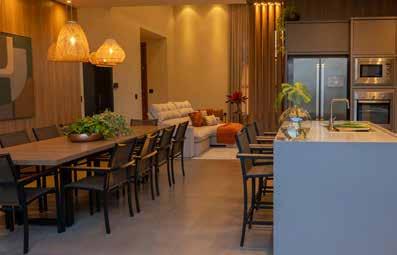 Mais do que estética, o projeto propõe um diálogo entre funcionalidade e conforto, praticidade e elegância. É destaque a integração da área externa aos espaços internos, como o gourmet e a sala de estar, que se tornam o coração do imóvel. O resultado é um ambiente amplo, fluido e convidativo. Além de soluções integradas, o projeto prima por valorizar materiais naturais, paletas neutras, luz natural e o verde ao redor, criando uma atmosfera intimista, leve e acolhedora.