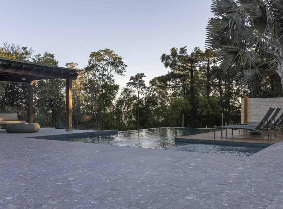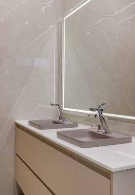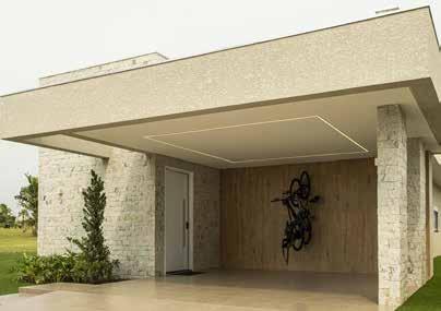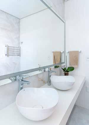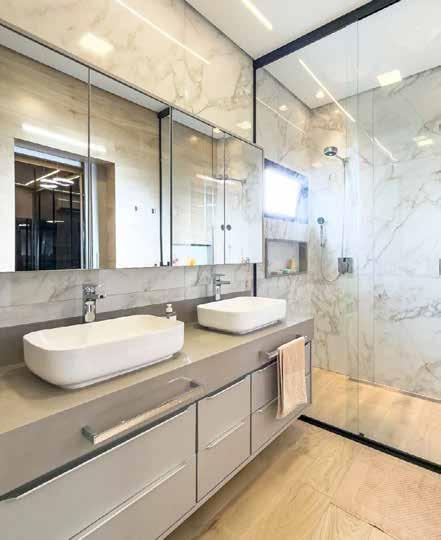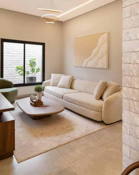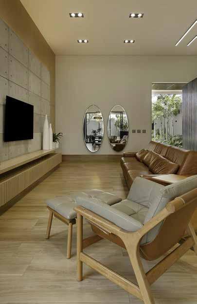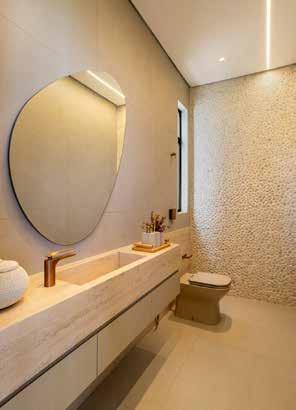 O piso em porcelanato e os revestimentos imprimem sofisticação e leveza. A paleta neutra e atemporal conversa com os elementos naturais, pedra e madeira, criando uma atmosfera serena, elegante e acolhedora. O resultado materializa o conceito de uma arquitetura feita com carinho e propósito.
