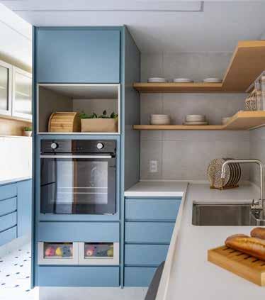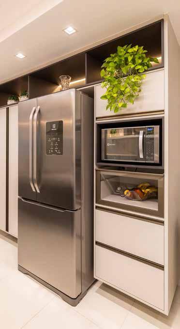 Harmônica e funcional, a cozinha gourmet é cheia de personalidade, com escolhas arrojadas, como o MDF na tonalidade Sálvia da Araucouma. A bancada clara na pedra Mármore Branco Paraná entrega um contraste na medida. Amadeirados no forro adicionam aconchego e naturalidade ao espaço.