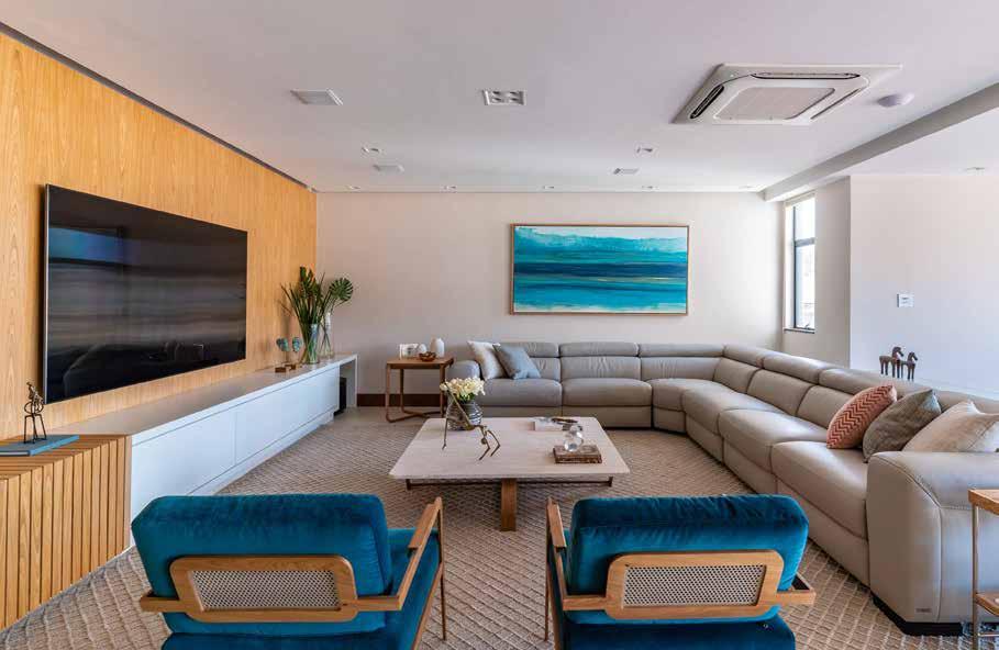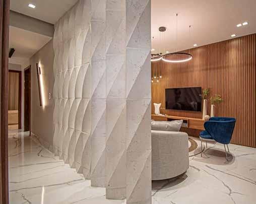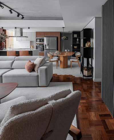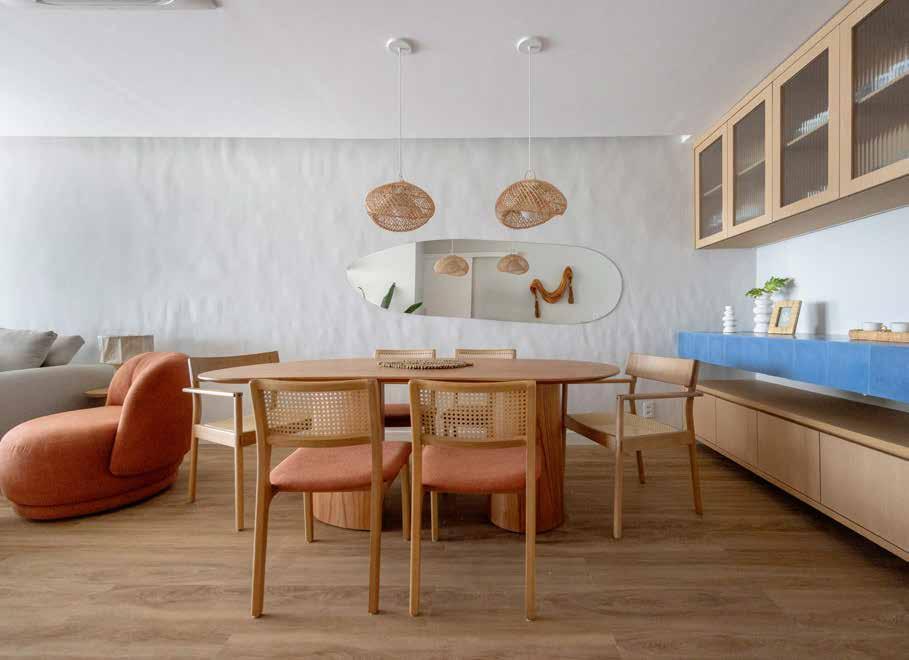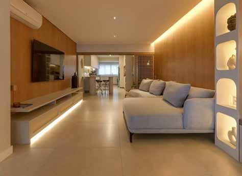 Esta reforma harmoniza estética contemporânea, funcionalidade e sustentabilidade. Nos ambientes integrados, é destaque o forro em PVC amadeirado, solução ecológica que alia beleza, durabilidade e conforto térmico. O material confere ao espaço um toque natural e sofisticado. No piso, o porcelanato polido intensifica a luminosidade dos ambientes, reforçando a sensação de amplitude e leveza.