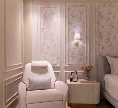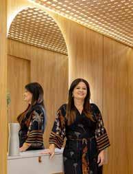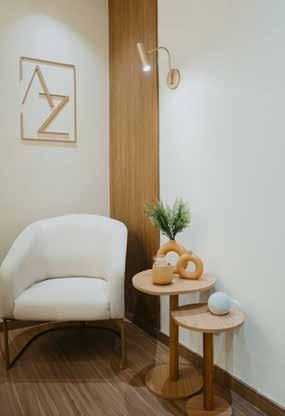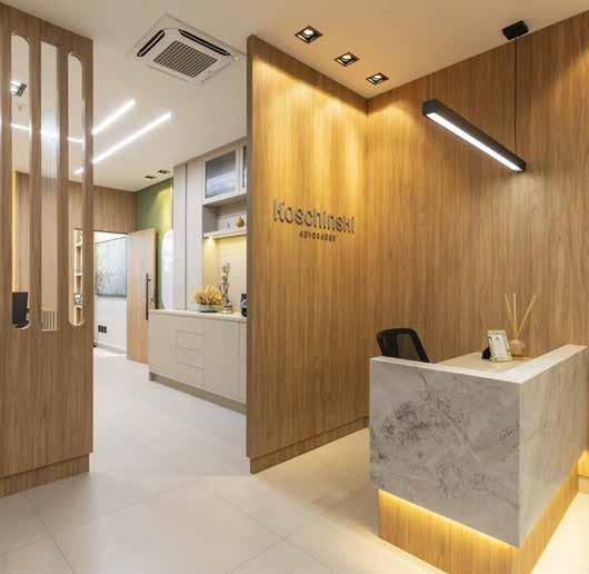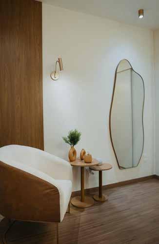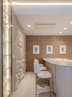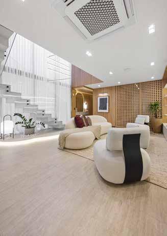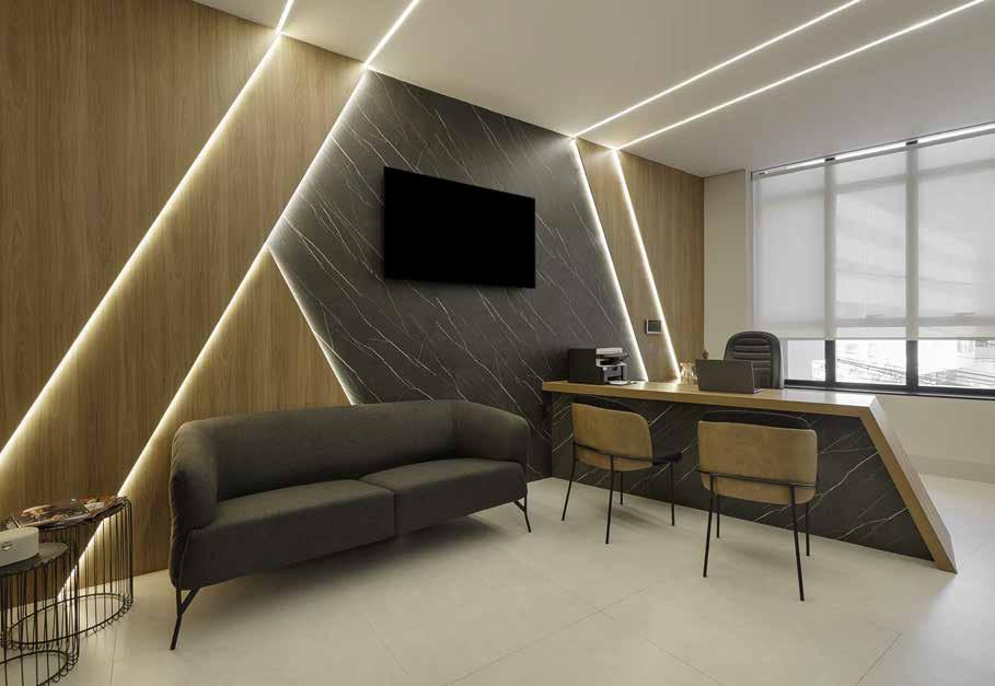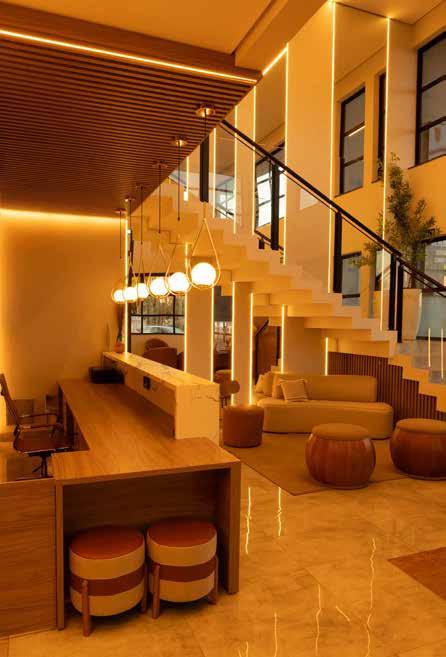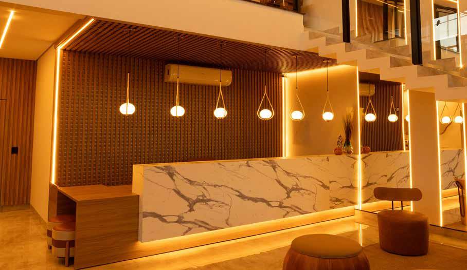 Entre os destaques deste projeto de interiores de uma clínica, o balcão revestido em mármore sintético com veios expressivos empresta força e funcionalidade ao ambiente de recepção. Acima dele, pendentes esféricos com design contemporâneo iluminam com charme e precisão. Refletindo a iluminação com delicadeza, o piso polido com acabamento marmorizado colabora com o layout de luxo e com a sensação de amplitude. A iluminação indireta em LED – no teto, nas paredes e na escada – cria um jogo de luz e sombra que valoriza a arquitetura e proporciona uma sensação envolvente e intimista. Integrando os dois pavimentos, a escada escultural ganha destaque. Espelhos estrategicamente aplicados ampliam o espaço e reforçam a profundidade. A marcenaria em madeira clara e os estofados em tons caramelo promovem aconchego. A atmosfera de conforto suaviza a frieza comum de espaços clínicos, sem abrir mão da elegância e do cuidado estético.