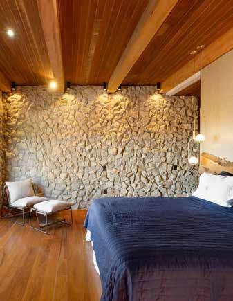 A estrutura rochosa e a topografia íngreme impunham desafios a qualquer projeto neste terreno. As escolhas arquitetônicas resultaram em um conjunto perfeitamente encaixado na expectativa dos clientes: uma casa térrea integrada com a natureza da área externa, com muita luz, ventilada, aconchegante e prática. Entre os materiais usados, merecem destaque os porcelanatos com cores neutras – ousando no preto do lavabo – e o ripado na cabeceira da cama. Na fachada, o aço corten contrasta com o verde e os tons terrosos. Internamente, objetos, flores, quadros e lembranças coloridas foram fundamentais para preencher o lar com vida.