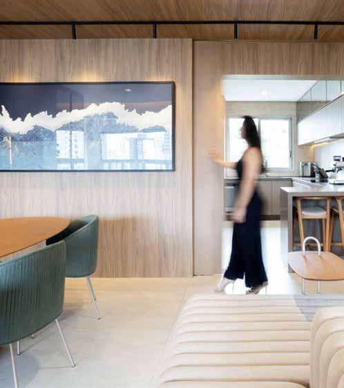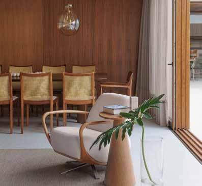 A paleta de cores neutra, com os tons da marcenaria, a escolha do piso, os tecidos, a pedra da bancada e o mobiliário solto geram uma conexão visual entre si e compõem a atmosfera acolhedora. A luz natural é protagonista, com as grandes aberturas favorecendo a ventilação e a entrada da claridade do dia, enquanto o projeto de iluminação destaca pontualmente cada ambiente conforme seu uso.