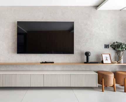 A neutralidade dos acabamentos dos pisos, com tabeira em porcelanato amadeirado e paginação geral em porcelanato cimentício, abriu a possibilidade de brincar com “ambientes dentro de ambientes”. A lareira em pedras naturais é destaque na sala de TV. Móveis atemporais e elegantes criam uma atmosfera convidativa, com conforto e bem-estar. A porta de entrada pintada em laca azul-turquesa, recepcionando quem chega, é ponto alto do projeto, que combina acolhimento e naturalidade em um só lugar.