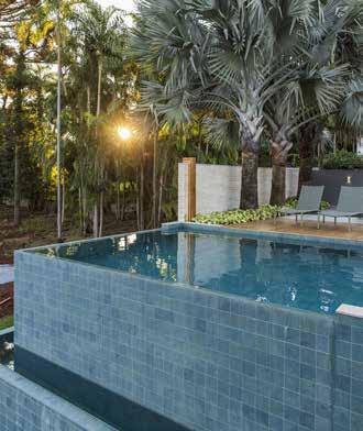 A adoção de uma paleta mais escura na área gourmet confere personalidade ao projeto. Lá estão combinadas pastilhas de vidro e bancada em granito preto. A área externa se integra ao projeto com piscina, sauna e hidromassagem. A composição com revestimento tridimensional branco e piso amadeirado imprime uma atmosfera leve e contemporânea ao ambiente que aproveita ao máximo o terreno.