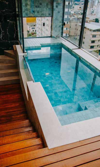 Uma banheira de imersão faz a ligação entre o banheiro e o closet do casal, que ganhou, assim, um espaço privativo diferenciado: o solário com fechamento em vidro retrátil cria um espaço de calmaria, tranquilidade e refúgio. Na área externa, a opção pelo spa de alvenaria proporciona maior durabilidade, personalização e valorização do imóvel. O uso de iluminação pontual em cada ambiente traz a sensação de aconchego, assim como a utilização de madeiras no teto e de lâmpadas de temperatura quente.