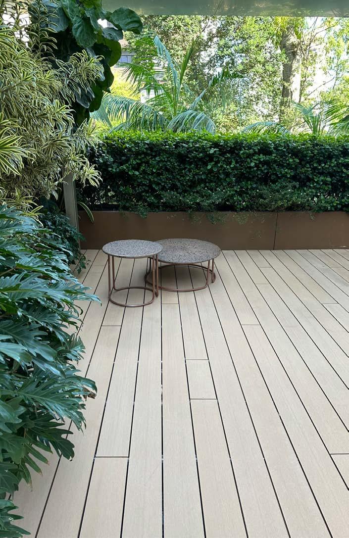 A ECOVALE ACABAMENTOS apresenta decks de alta performance em madeira sintética, desenvolvidos com a exclusiva tecnologia SuperWPC. Projetados para oferecer beleza, durabilidade e sustentabilidade, eles são a escolha ideal para projetos que buscam aliar sofisticação e funcionalidade em ambientes externos. Com aparência e toque que remetem à madeira natural, os decks são fabricados com materiais recicláveis e possuem 15 anos de garantia. Sua resistência a água salgada, cloro, fungos, cupins e ação da maresia os torna perfeitos para piscinas, jardins, áreas de lazer e ambientes costeiros. Além disso, não propagam fogo, não racham, não lascam e não soltam farpas. Estão disponíveis em diversas cores, oferecendo opções que harmonizam com diferentes estilos de projetos arquitetônicos. Seu design modular facilita a instalação e permite explorar formas orgânicas que interagem perfeitamente com a natureza.