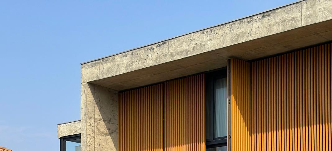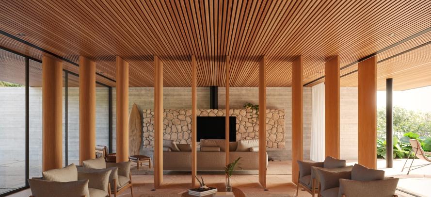 O PROJETO MESCLA MADEIRA, PEDRA E A MODERNIDADE DO CIMENTÍCIO